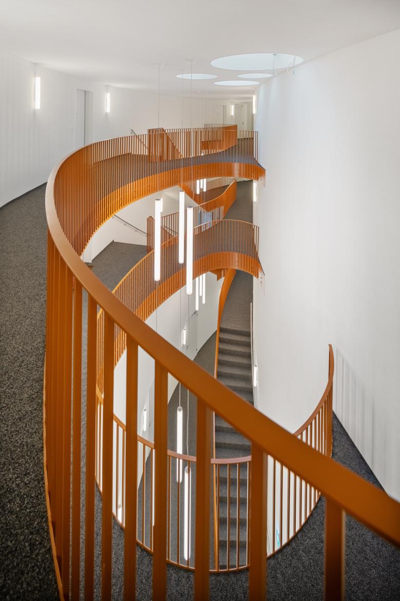 Im Erdgeschoss ist auf Strassenniveau, dem inneren - ebenfalls durch die geschwungene Form geprägten - vertikalen Erschliessungsraum vorgelagert, eine Gewerbenutzung vorgesehen.