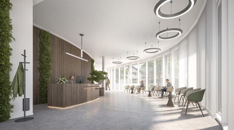 Volumetrisch an die südöstlich an der Landstrasse gelegenen Bestandesbauten anschliessend und den leichten Drall der vielbefahrenen Verkehrsader strassenseitig aufnehmend, biegt sich das elegante Gebäude an der Kreuzung der Breitestrasse zur charakteristisch asymmetrischen Bogenform und führt den Strassenverlauf so auf selbstverständliche Weise zur eigenen Zufahrt und ins anliegende Quartier fort.