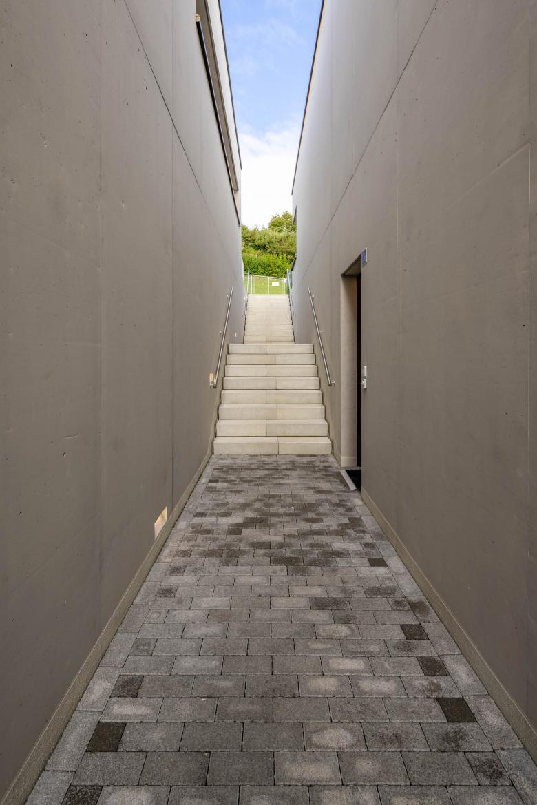 Das exakt in die exklusive Hanglage eingepasste zweiteilige Terrassenhaus besticht durch seine expressive Architektursprache. Die zueinander versetzten, teils zurück gestaffelten, teils auskragenden Gebäudevolumen sind so angeordnet, dass jede der fünf grosszügigen Wohnungen genügend Privatsphäre, eine optimale Besonnung und eine von der herrlichen Fernsicht profitierende Terrasse aufweist.