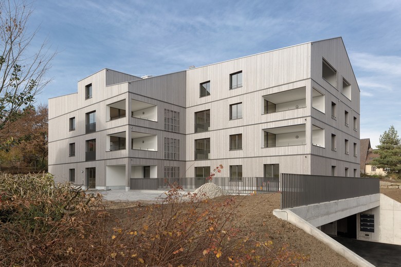 Eine einfache Typologie prägt das gesamte Gebäude: Zwei ineinandergeschobene Kuben mit je zwei Wohnungen werden durch einen gemeinsamen attraktiven Erschliessungsbereich verbunden. Jeder Wohnung ist eine grosszügige, gedeckte Loggia zugeordnet. Eine rationelle und wirtschaftliche Bauweise bei gleichzeitig hoher Wohnqualität ist Leitgedanke des Entwurfs. Die ebenerdige Erschliessung über einen Lichthof sowie geschossübergreifende räumliche Beziehungen fördern die Kommunikation der Bewohner untereinander.