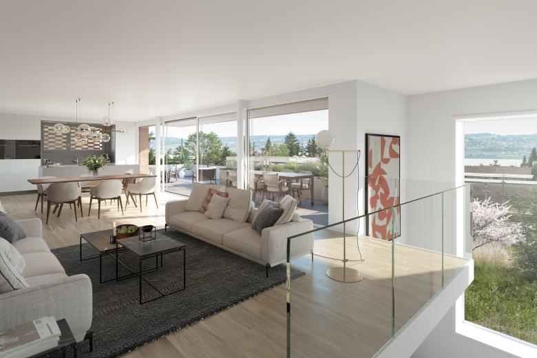 Die geräumigen Terrassenwohnungen verfügen über einen überhohen zweigeschossigen Erschliessungsraum in Form eines Erkers, der den spektakulären Sichtbezug zum See noch verstärkt.