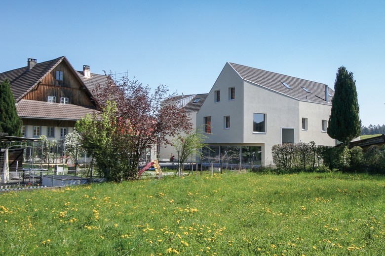 Die helle Putzfassade übernimmt Gestaltungselemente des bestehendes Bauernhauses und fügt sich in die Gesamtkonzeption der Überbauung ein. Die Schrägdächer ohne Dachvorsprung zeugen vom Spannungsfeld von Alt- und Neubauten. Im Inneren dominiert eine einfache, zweckmässige und moderne Materialgebung.