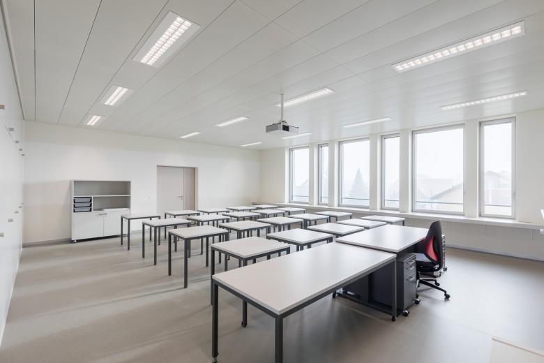 Ein einfaches Grundrisssystem mit einer einhüftigen Erschliessungszone prägt den neuen Baukörper und kann so die geforderten Nutzungen auf kompaktem Raum in sich vereinen. Im „Kopf“ des Gebäudes sitzt ein Mehrzwecksaal, der auch von externen Nutzern bespielt werden kann. Den Bezügen zwischen Innen und Aussen wird besonders grosse Aufmerksamkeit geschenkt.