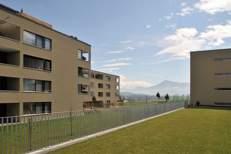 Insgesamt umfasst die Überbauung 121 Wohnungen (Eigentum und Miete) in drei verschiedenen Häusertypen und rund 700 m2 Gewerbe ächen in einem Wohn- und Gewerbehaus. Bei sämtlichen Grundrissen wurde besonders auf eine exible Nutzbarkeit sowie eine gute Belichtung durch gross dimensionierte Fenster ächen geachtet. Dank optionaler, nicht tragender Zimmerwände konnte exibel auf Kundenwünsche reagiert werden.