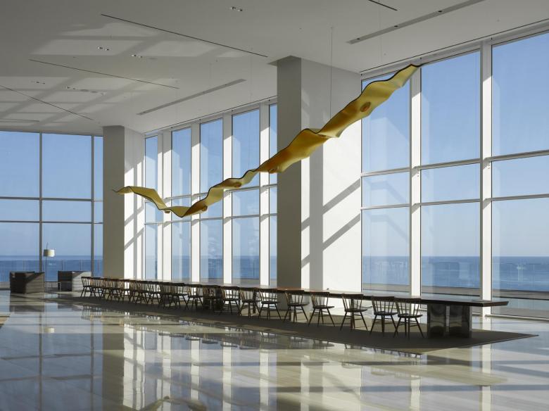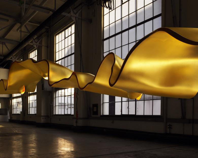 2015 gestaltete Ingo Maurer ein Golden Ribbon mit der außerordentlichen Länge von 13,5 Metern für die Lobby des Seamarq Hotel in Gangneung an der Ostküste Südkoreas. Architektur von Richard Meier & Partners.