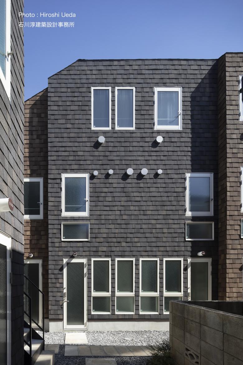 This is an apartment complex completed in Setagaya-ku, Tokyo, designed and supervised by our firm according to the basic concept planned by the owner of the complex. It is a three-story steel-framed building with the first floor as a statutory row house and the second and third floors as apartment buildings. The exterior walls are clad in asphalt shingles to create an image similar to that of the project owner's European townscape facade. The windows were designed to be fireproof by law, but fireproof sashes for wooden houses were used to reduce the cost of the project.