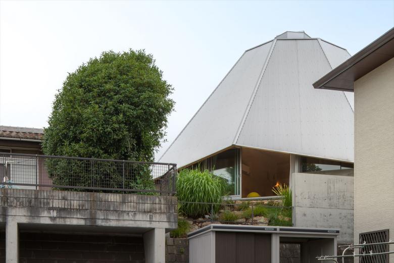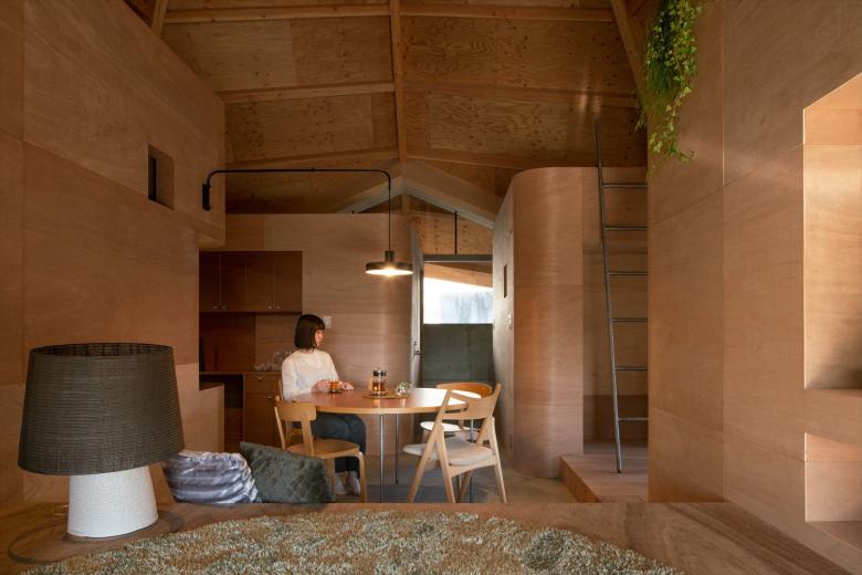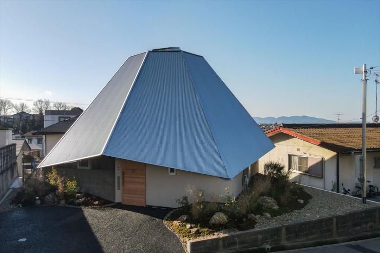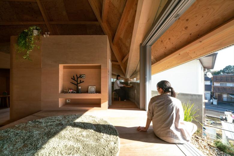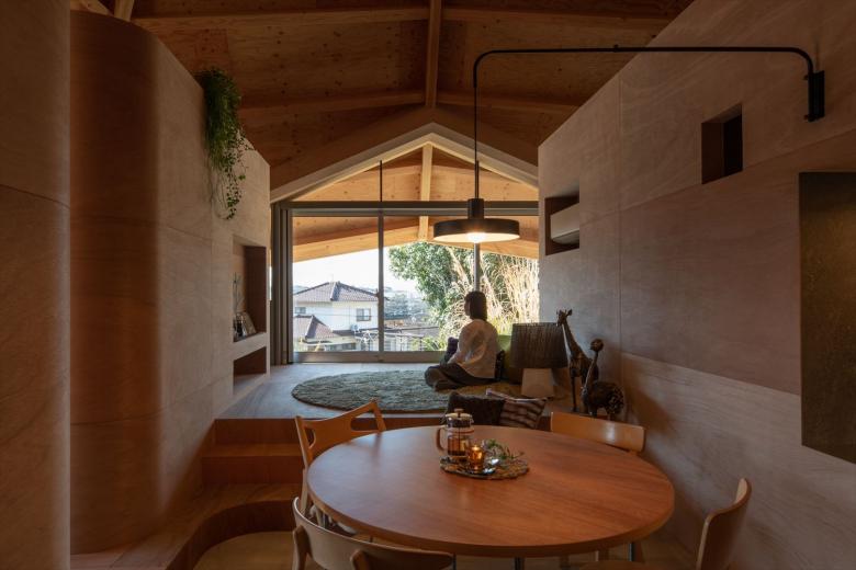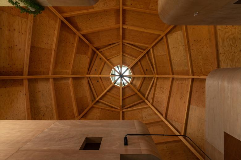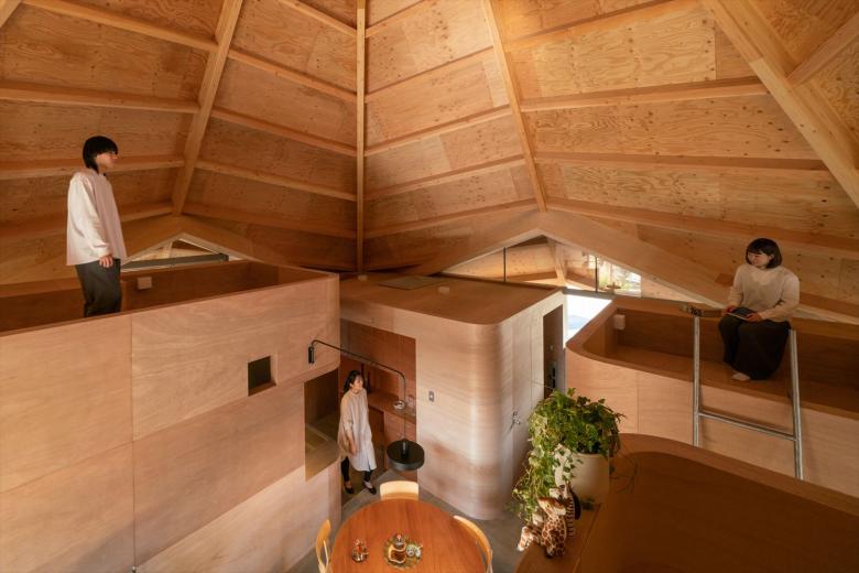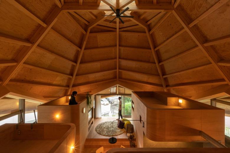 Specifically, an octagonal spider-web-shaped structure is covered extending down from the top section to the supporting legs to create a centripetal single-room space. The legs are supported at four points, and the inside and outside are connected via triangular openings joining the vertices between the fulcrums. Inside the 77 square meters of open space, four boxes, which are not rooms, are arranged to create a corridor-like area that functions as the family room and living space. In other words, there are no enclosed individual spaces here, but family members may freely engage in their favorite activities in an open space/corridor.