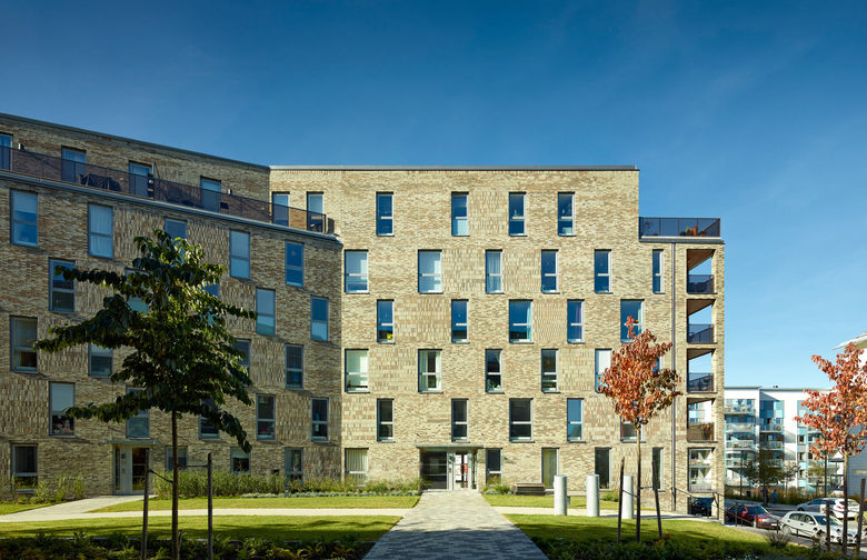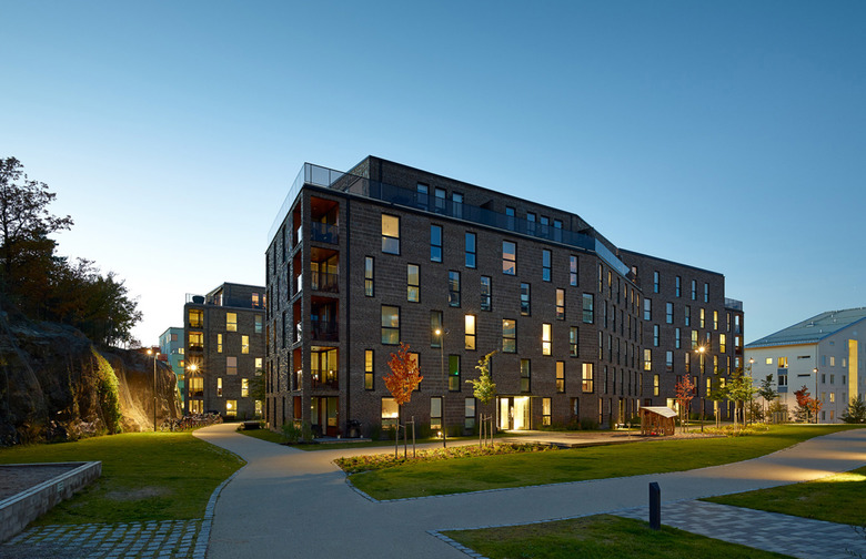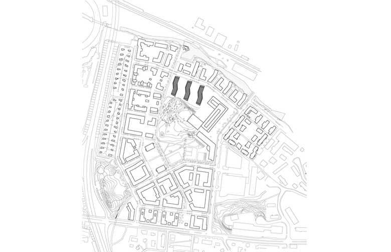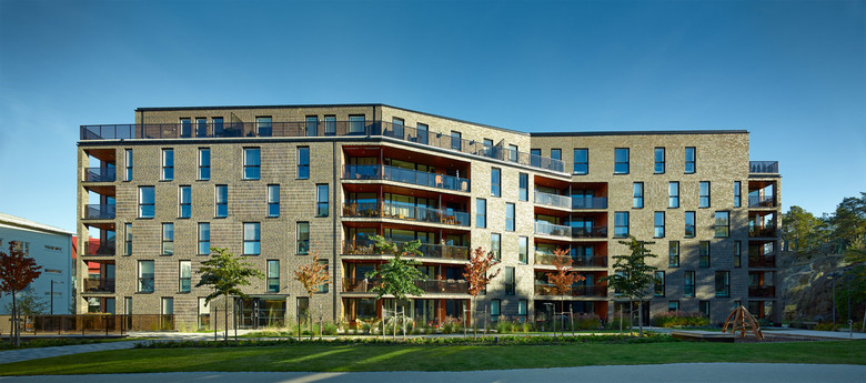 The plot is on a slope between a waterway bordering onto Sundbyberg in the north and the new neighborhood park to the south. In the original master plan the plot was intended for 6 tower blocks, but in order to make the most of the site's topography and create a connected garden around all three houses, K + S chose to join the 6 buildings to form 3 parallel, twice folded six-storey buildings. The resulting shape in plan gives the buildings a distinct direction that accentuates and enhances those inherent in the plot.