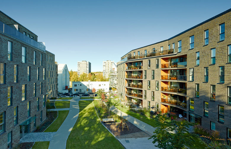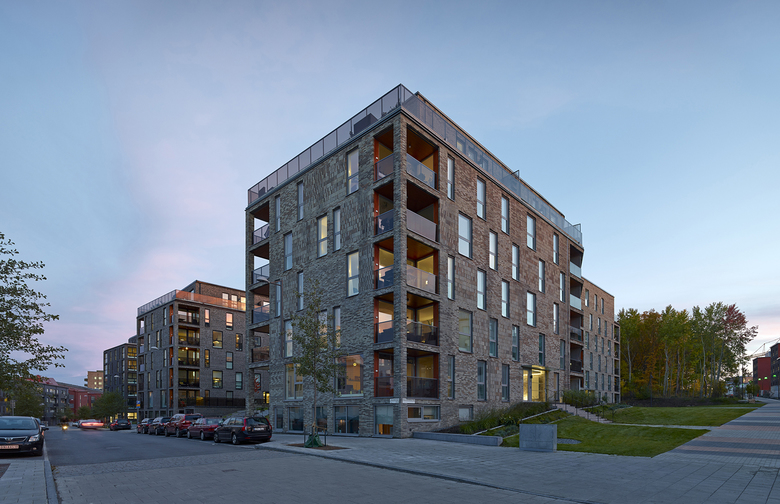 The plan configuration creates interesting outlooks from the apartments and helps to reduce noise from the nearby rail traffic. The buildings' brick facades have three colour variations, pattern effects in the brickwork designed to be visible from a distance, which is the project's handling of the larger scale. Details such as the materiality of the insides of the balcony niches differentiate the various buildings. The apartment buildings have recessed balcony niches with generous glazing and light glass handrails - the outdoor space virtually resembles an indoor room, offering a good climate and shelter all year round. The partially retracted top storey has a varied façade, flush with that of the rest of the building at some points but otherwise set back, thus providing roof terraces.