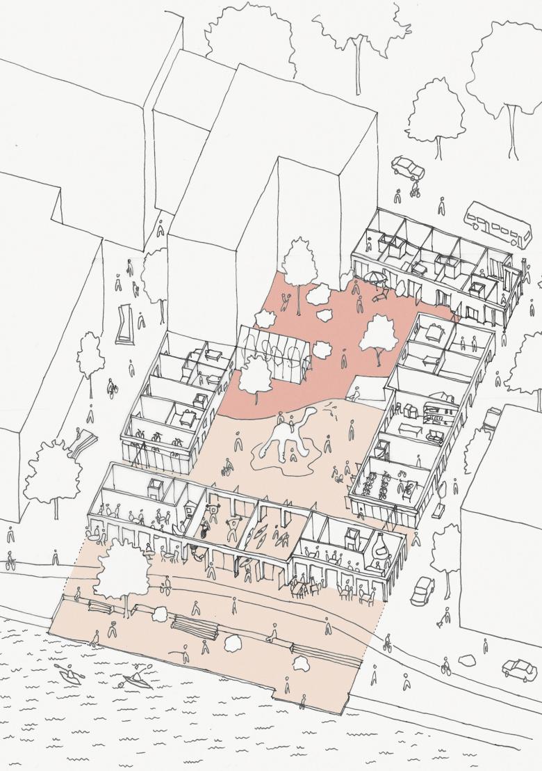 The quay extends inside the block becoming a central feature both emotionally and physically through its materiality, paving and green structure. Conceptually, the southern part of the block stands exposed on the quay. The life on the waterfront can continue inside, under the building volumes, into the inner courtyard with a favourable microclimate, protected from rain and wind, in the sun or shade.