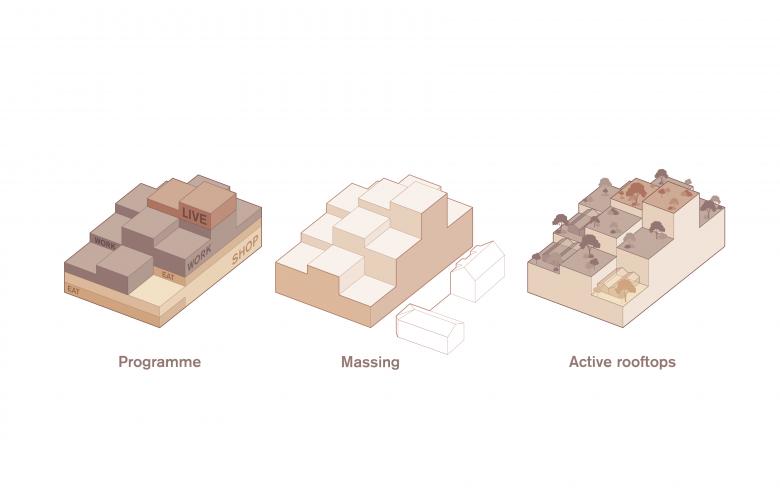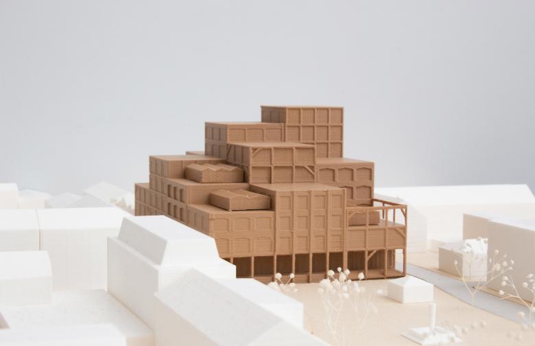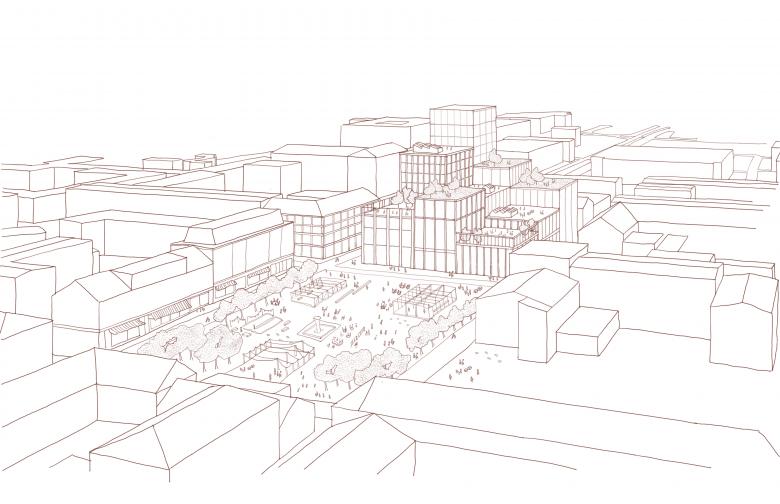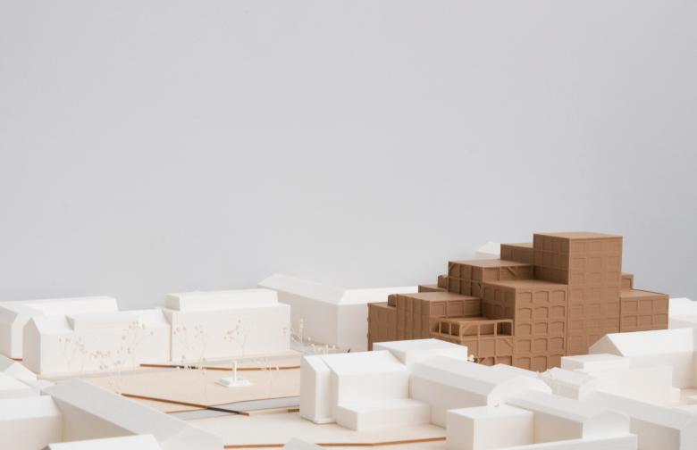 The structural division of the building volume into twelve parts provides long-term flexibility in favour of various uses and for content to be developed over time. The 20,000 sqm programme is expressed as a series of cubes with varying heights. The massing of the block is tallest in the centre whilst meeting the surrounding buildings and streetscape with a lower scale.