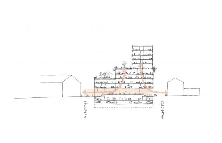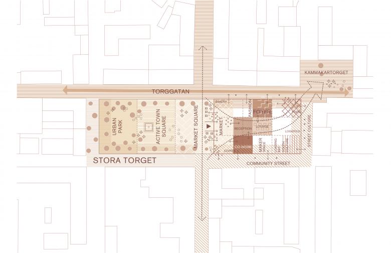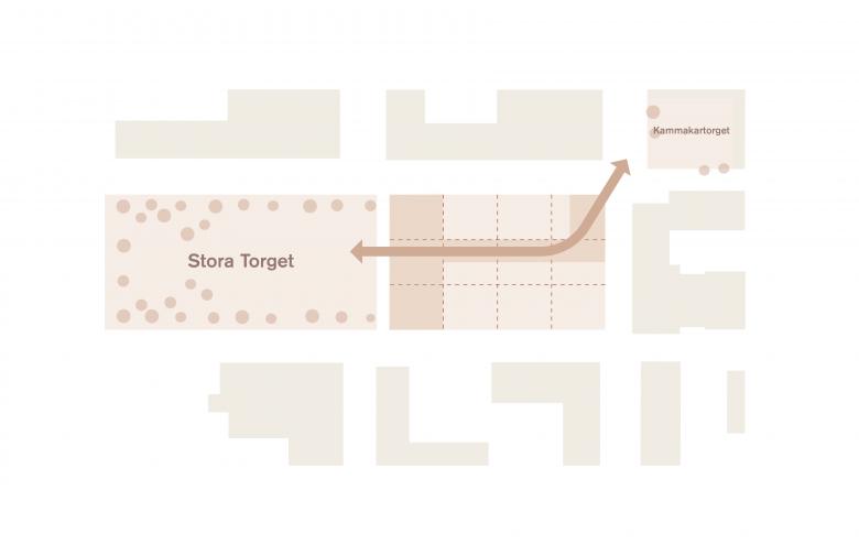 The city block is located between two town squares, Stora Torget and Kammakartorget and with its new inner structure establishes a distinct connection to the surrounding urban fabric. The ground floor is designed as an extension of the public activities on the square, providing outdoor cafés and restaurants, market stalls and places to stay. Via an indoor street, its spatial sequence stretches from the square through a new arcade to a corner with Torggatan, the main pedestrian street of the town.