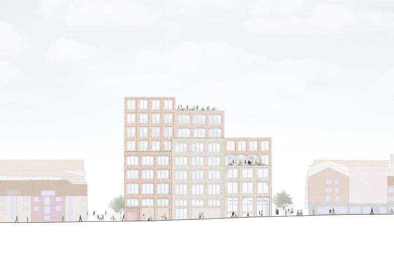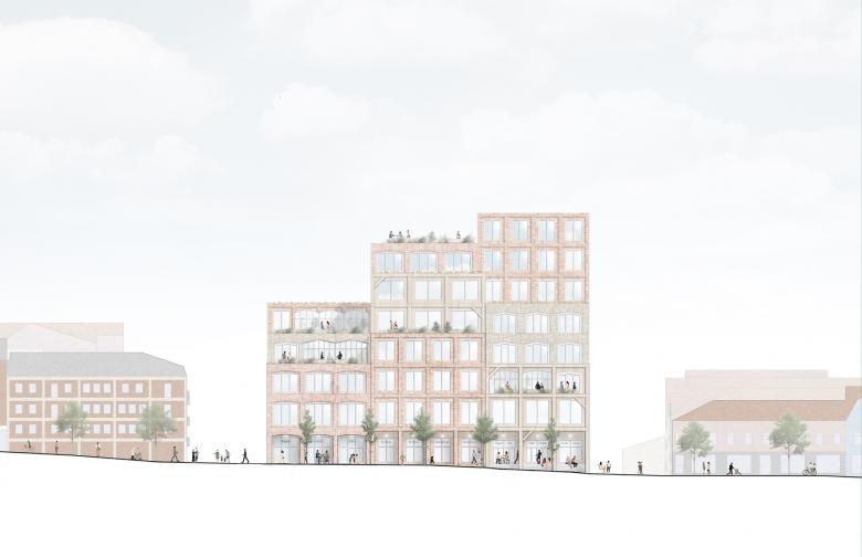 The overall design aims to create a distinct social meeting place, stretching both indoors and outdoors. Active frontages, many entrances, new arcade and a generous fenestration indicate an open public character evident in both the architectural expression and the materiality. The structural frame is made of timber and the brick envelope relates to the surroundings with its careful selection of tones. The objective is to address the Global Sustainability Goals by choosing natural materials that are locally produced and long-term robust.