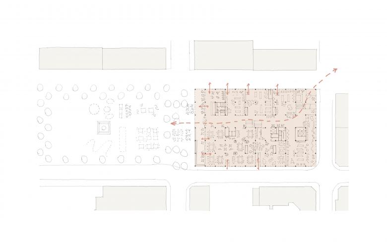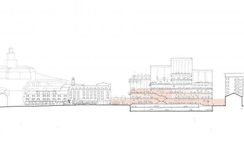 The new Paushuset provides a mix of town centre activities and housing. Commercial units, restaurants and marketplaces on the street level are combined with exhibition spaces and workplaces that continue upstairs, with entrances evenly distributed along the perimeter. Outdoor cafés and restaurants offer seating both on the square as well as on roof terraces on the first floor with vistas of the surrounding area. Residential units are located higher up, provided with own roof terraces and conservatories as shared amenities.