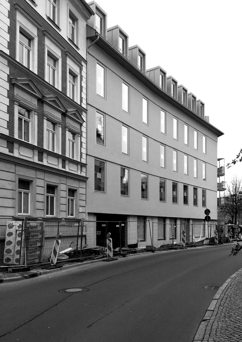 Der Entwurf des Eckhauses am historischen Mainzerhofplatz ist Teil der heterogenen umgebenden Bebauung, die auf mittelalterlichem Stadtgrundriss entstanden ist. Dem ungeordneten Durcheinander“ von Stilen und verwendeten Materialien setzt der Entwurf auf eigenständige Weise eine ruhig proportionierte und regelmäßig aufgeteilte Fassade mit gleichen Fensterformaten entgegen. Die 13 Wohn- und Gewerbeeinheiten werden über ein in der Ecke liegendes kreisrundes Treppenhaus mit Aufzugsanlage erschlossen. Die durch leichte Abwinklungen in der Gebäudeflucht entstehenden Lichtbrechungen und Schattenwirkungen dienen der Einfügung in den Kontext. Zusätzlich sind die Geschosse nach außen versetzt, und erhalten die für Erfurt typische außen flächenbündige Fensterkonstruktion mit kräftiger Rahmung.