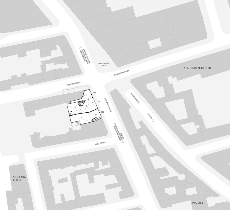 Die Gebäude in der Karl-Marx-Strasse 108 (EG) 110 und 112 sollen im Zuge einer geplanten Revitalisierung einer neuen hybriden Nutzung zugeführt und das städtebaulich architektonische Erscheinungsbild aufgewertet werden. Das derzeit monofunktional genutzte Gebäude 110 (H&M) nimmt in dem neuen Konzept eine zentrale Rolle ein. Dies wird durch bauliche Erweiterungen in den obersten Geschossen, differenzierte Nutzungen zwischen Dienstleistung, Sudios, Lebensmittelhandel und Wohnen sowie vollständig neue Fassaden zum Ausdruck gebracht. Das Haus 112, einem Haus aus den 80er Jahren mit postmoderner Fassade, wird in ausgewählten Geschossen mit dem Gebäude 110 zusammengeführt und erhält eine dem Gesamtkonzept angepasste Fassade.