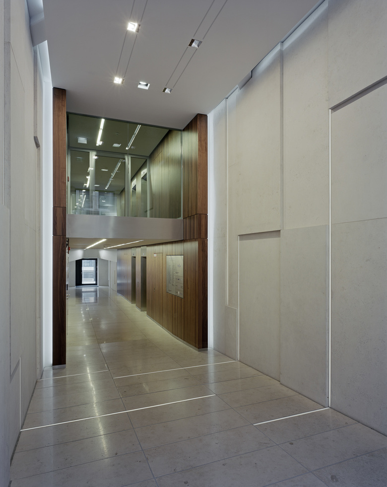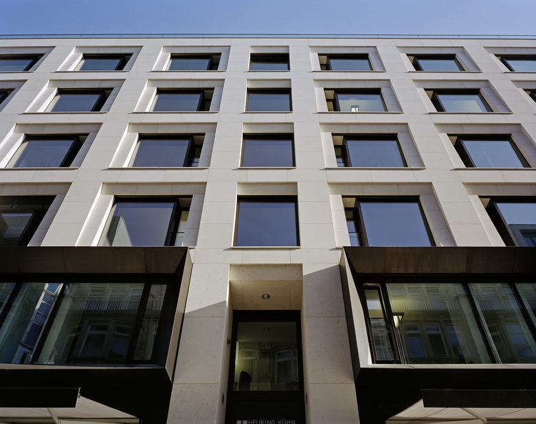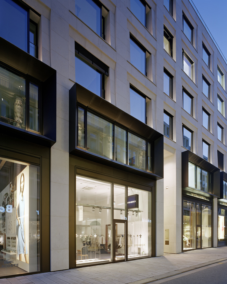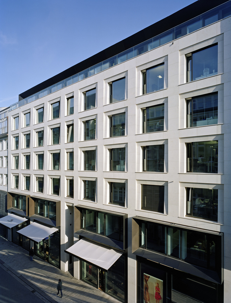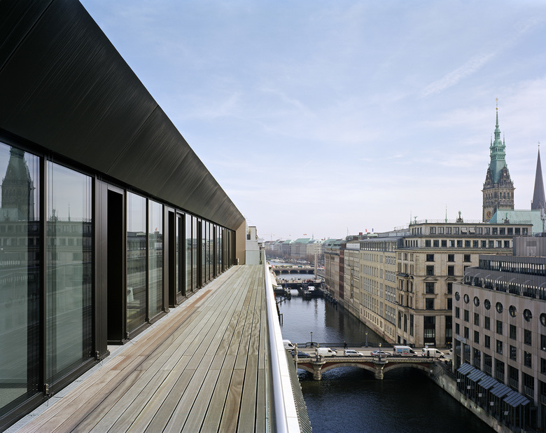 Die mit einem Neubau vergleichbare Revitalisierung des Gebäudes aus den 80er Jahren besteht aus einem Neubau der Fassade und einem Neuaufbau von 5 Obergeschossen bei Erhalt des Bestandskerns. Das 8-geschossige Gebäude mit 3 Läden und großzügiger Lobby im Erdgeschoss erstreckt sich vom Neuen Wall bis zum Alsterwanderweg am Alsterfleet. Das Gebäude erhält eine neue formale Ausprägung und wird, seinem Umfeld entsprechend, geprägt von einem klassischen Fassadenaufbau mit Sockelzone und Mezzaningeschoss, einem Mittelteil mit einer fein profilierten Lochfassade und einem Dachabschluss in Form eines gerahmten und voll verglasten Staffelgeschosses. Die Bürogeschosse mit bis zu vier Mieteinheiten pro Geschoss werden zusätzlich über zwei neue, ebenfalls voll verglaste Innenhöfe belichtet. Die Fensteröffnungen der steinernen Lochfassade erhalten ein rahmenhaftes Relief von leicht schrägen, gefalteten Naturstein-Flächen und sind in der Verglasung zweigeteilt. Das große Panoramafenster bildet jeweils eine Festverglasung, während der schlanke, vertikale Lüftungsflügel deutlich zurückspringt. Auf diese Weise erhält die Fassade ein spannendes Schattenspiel und einen besonderen Fokus auf die großzügigen Panoramafester. Am Neuen Wall wird das heutige 2. Obergeschoss als Mezzaningeschoss ausgebildet und erhält vier auskragende Erker über dem Gehweg. Zusammen mit den großzügigen Schaufenstern der Ladenfassade wird damit eine Art Sockelzone ausgebildet, die mit dem Bestand der Nachbarn eine horizontale Entsprechung erfährt. Die Materialität der Fassaden wird geprägt von einem hellbeigen, gestrahlten Jura-Naturstein in großen Formaten und Rahmenelementen aus goldbraunem eloxiertem Aluminium.