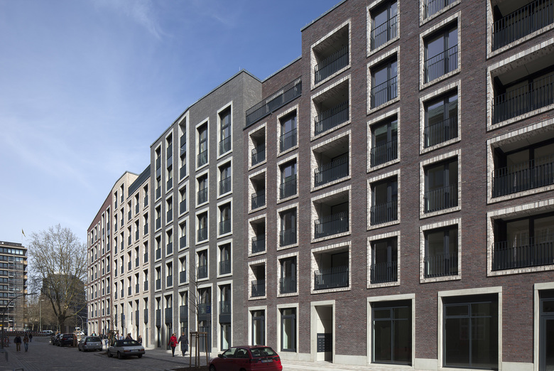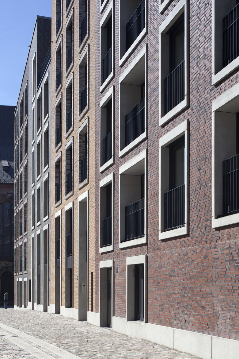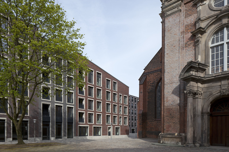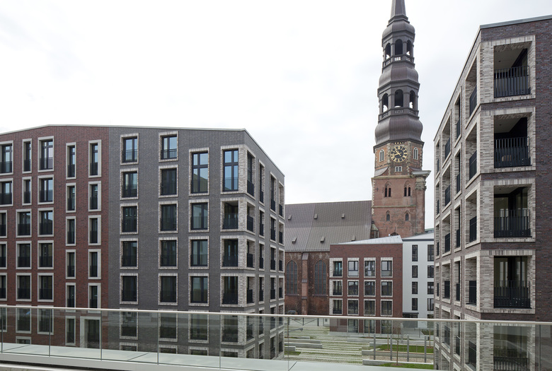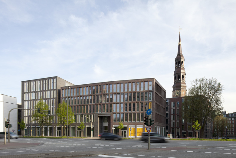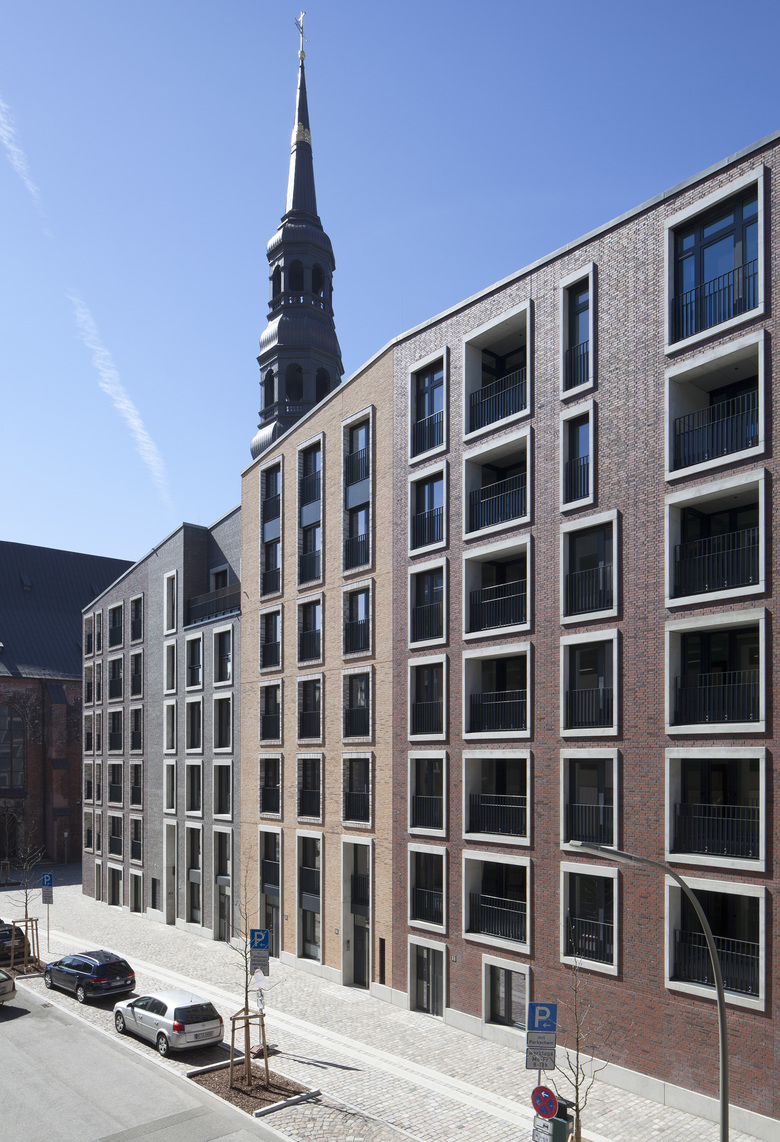 In der Hamburger Innenstadt, zwischen Willy-Brandt-Straße im Norden und der Kirche St. Katharinen im Süden ist das Katharinenquartier entstanden. Das Gebäudeensemble besteht aus einem Büro- und Geschäftshaus sowie zwei Wohngebäuden im Quartierinneren. Dabei sind insgesamt ca. 6.400 m2 Mietflächen für Büro- und Gewerbenutzung sowie 131 neue Wohnungen entstanden. Die Gebäude gruppieren sich um einen grünen Innenhof, der tagsüber öffentlich zugänglich ist. Unterirdisch sind alle Gebäude durch eine gemeinsame Tiefgarage mit 152 Stellplätzen verbunden. Auf Basis des städtebaulichen Masterplans und Vorentwurfes zu den Wohngebäuden von Darlington Meyer Architekten (Zürich), fügen sich die drei Häuser in der Gebäudeform, ihrer Höhe und in der Fassadengestaltung zu einem harmonischen Gesamtbild. Die Fassaden werden vornehmlich von einem kleinteiligen und differenzierten Umgang mit dem für die Altstadt typischen Material Backstein geprägt. Die Fassade des Bürogebäudes verdeutlicht mit dem Stützraster von 1,35m die innere Nutzung. Durch Variationen von Stützenbreite und Stützenform werden zwei subtil unterschiedliche Fassadenthemen für den sechsgeschossigen Teil einerseits, und den fünfgeschossigen Riegel andererseits geschaffen. Die geschosshohen Fensterelemente sind als Verbundfenster mit einer Einfassung aus Aluminium ausgeführt. Die 4-7 geschossigen Wohngebäude erhielten farblich differenziert Klinkerfassaden, welche die Parzellenstruktur der historischen Altstadtbebauung aufgreifen. Die kontrastierenden Fenstereinfassungen wechseln zwischen einem hellem Wasserstrich-Klinker und Betonfertigteilen. Die umlaufende Sockelzone mit den ein- bis zweigeschossigen Einfassungen ist in Fertigteilen ausgeführt. Aufgrund der Schallproblematik des innerstädtischen Standortes erhalten die Wohn- und Schlafräume lärmoptimierte Fensterkonstruktionen als Kastenfenster im Seitenfeld. Die Dachlandschaft des Ensembles reagiert mit Ihrer Höhenentwicklung auf das Städtebauliche Umfeld, insbesondere der Kirche, und bietet mit ihren Einschnitten an der Traufe und in der Dachfläche spannungsreiche Ausblicke Richtung Stadt und Hafen.
