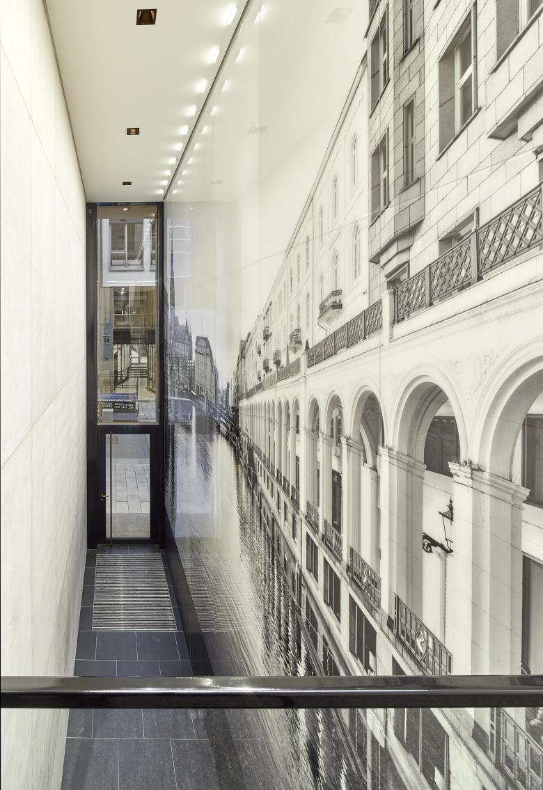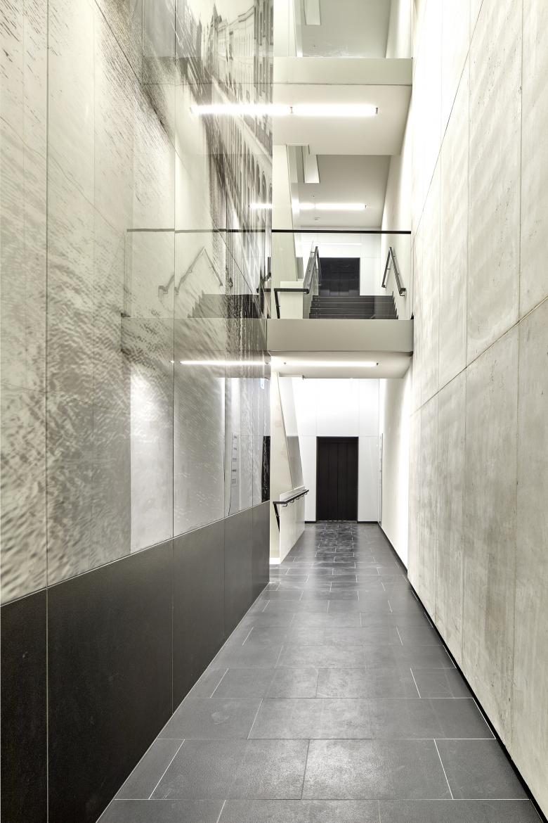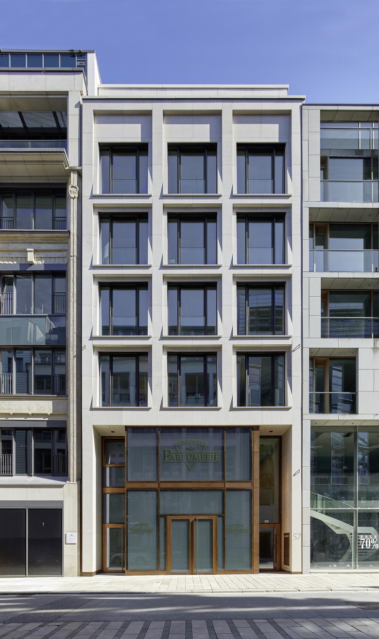 Als Fassadenmaterial wird ein heller Naturstein verwendet. Die zweigeschossige Ladenkonzeption wird dazu genutzt, einen übergroßen Schaukasten herzustellen, der sich durch die zurückgesetzten Eingänge als eigen-ständiges Element heraushebt. In den oberen Etagen dominieren große, bodentiefe Fensteröffnungen das Fassadenbild und sorgen für eine gute Belichtung der Büroräume. Gleichzeitig bieten sie dem Mieter einen optimalen Blick auf den Neuen Wall beziehungsweise Alsterfleet.