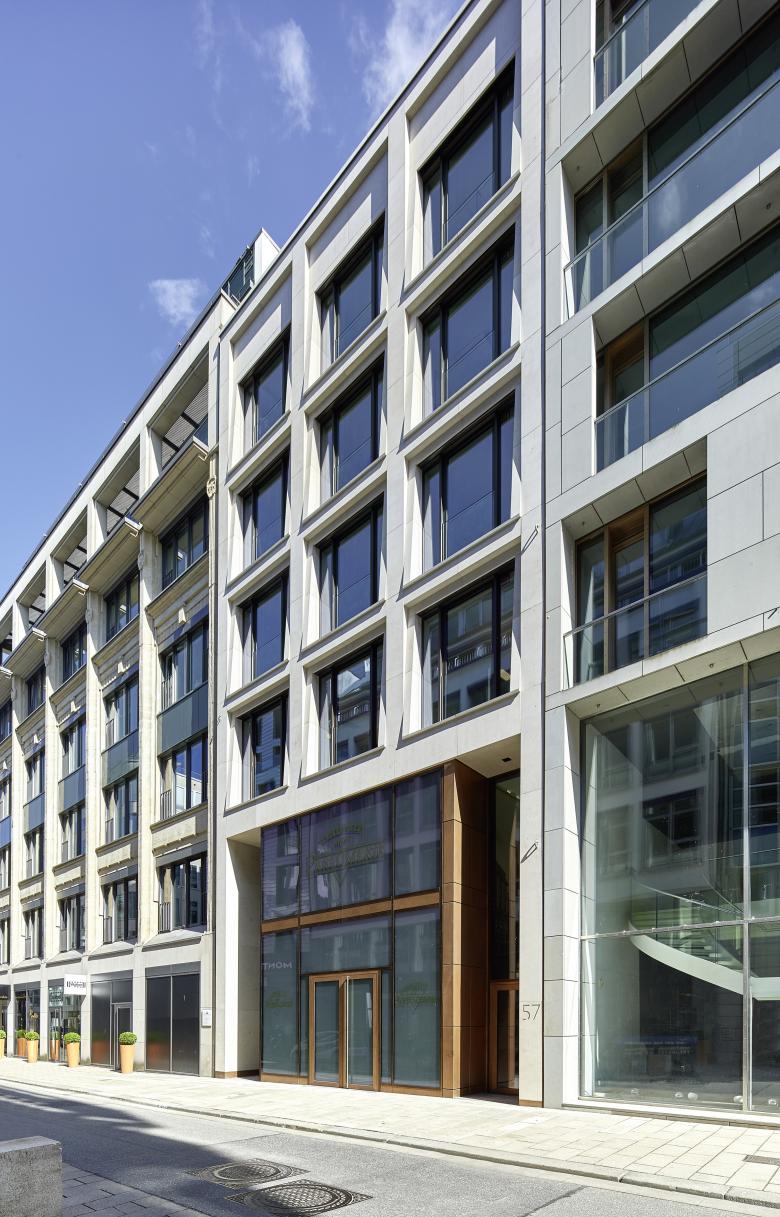 Das Büro- und Geschäftsgebäude am Neuen Wall 57 besteht aus 7 Obergeschossen und einem Unterge-schoss. Es gliedert sich in drei Bereiche: eine großzügige Sockelzone vom EG - 1.OG, darüber liegende vier Etagen und schließlich folgt eine Rückstaffelung des letzten Geschosses. Die Brüstung der daraus entste-henden Dachterrassen bildet den Abschluss der Fassade und dient gleichzeitig als optische Erhöhung, um selbstbewusst zwischen den direkten Nachbargebäuden seinen Platz einzunehmen.