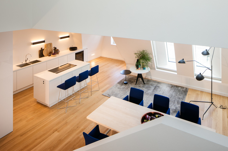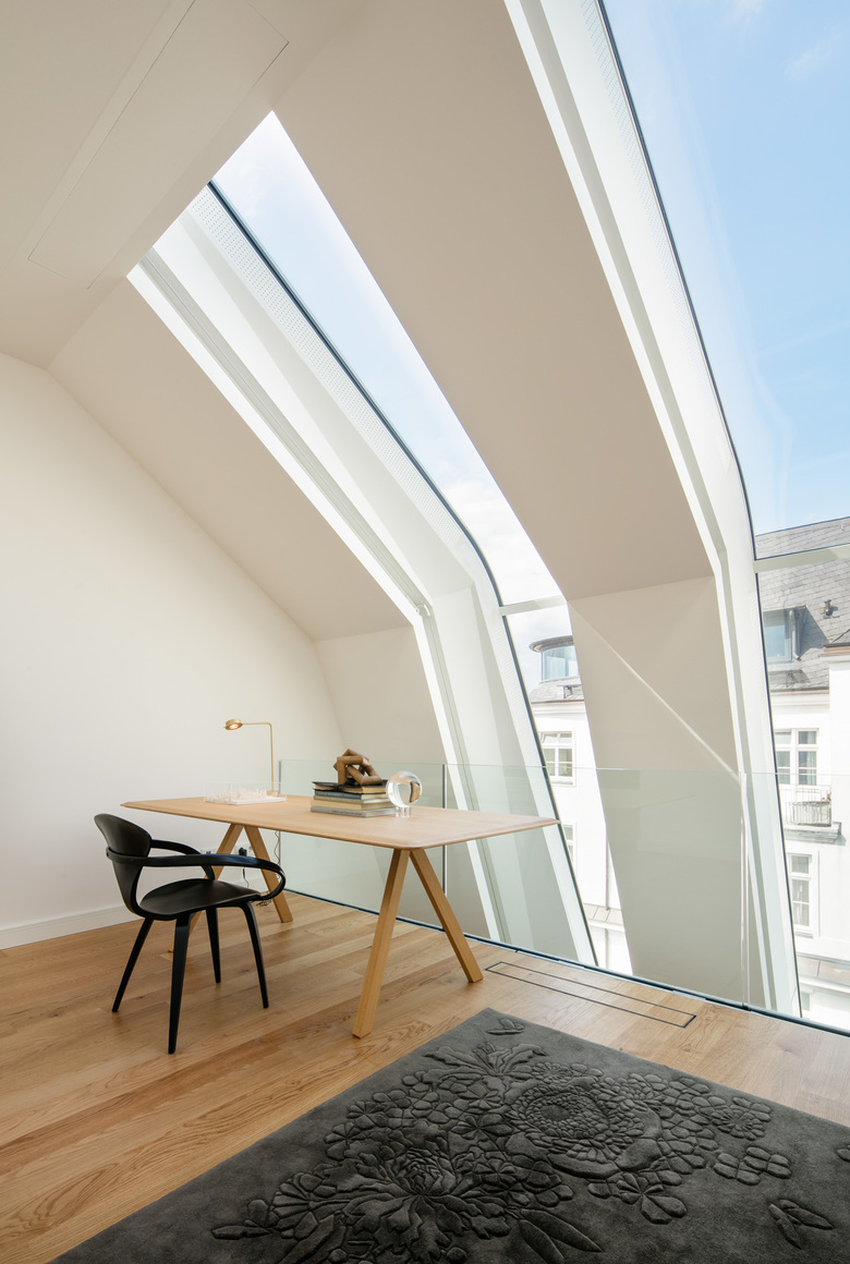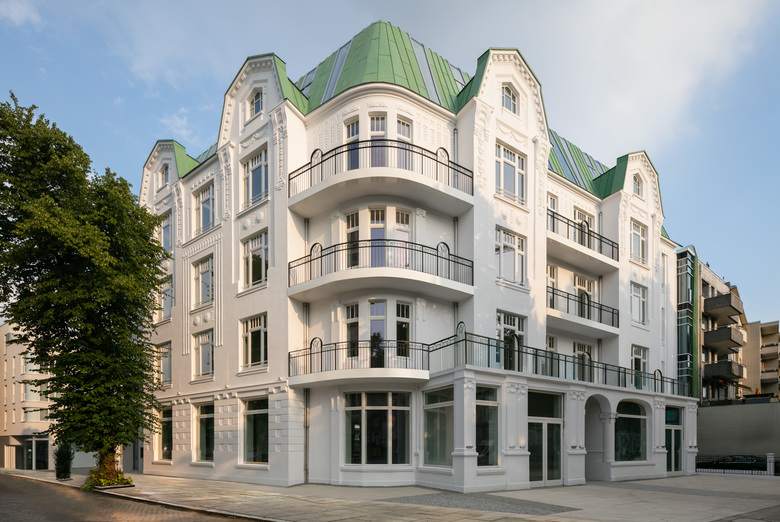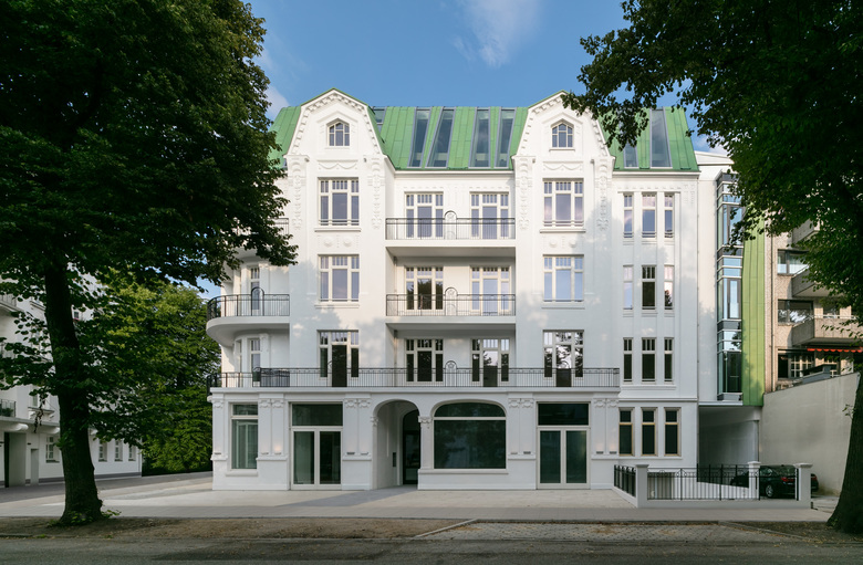 Das „Apartimentum“ ist ein neu errichtetes Wohn- und Geschäftshaus unter Erhalt der gründerzeitlichen Fassade am Mittelweg in Hamburg-Rotherbaum. Die Bestandsfassade wurde um einen zweigeschossigen Dachkörper ergänzt, dessen Fensterbänder aus dem Prinzip eines Barcodes abgeleitet wurden. Zum Innenhof zeigt sich der Neubau mit moderner Fassade. Der Bauherr hat das Gebäude konsequent als Smart-Home entwickeln lassen – von der Eingangstür bis zur Wohnungsausstattung lässt sich das Haus digital bedienen.