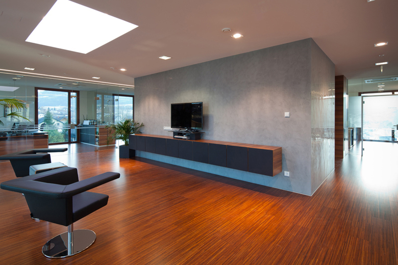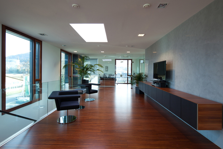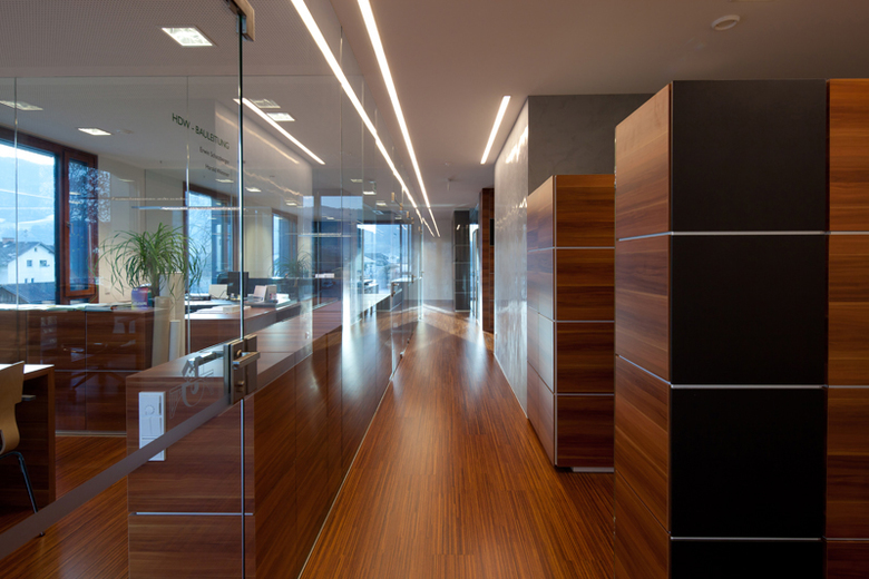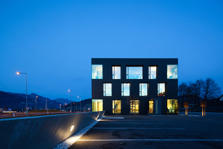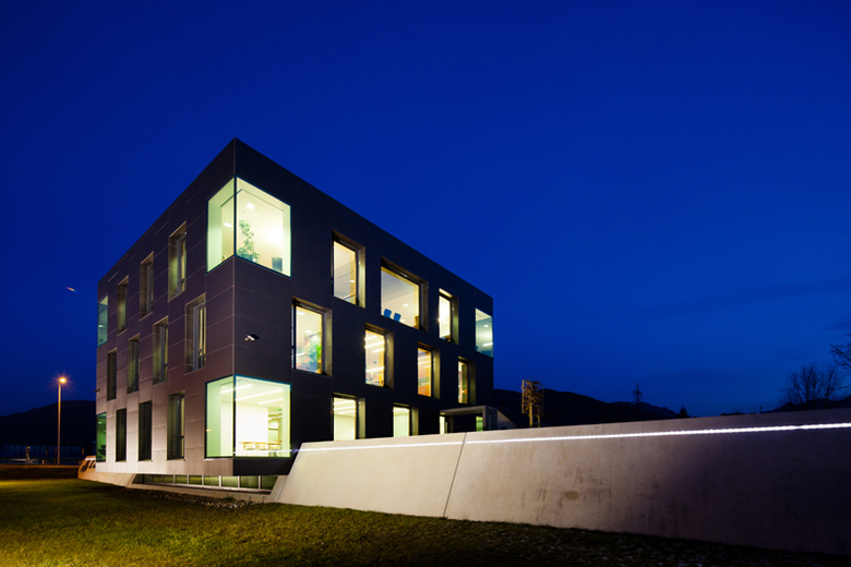 Das monolithische Gebäude lebt vom Wechselspiel der horizontalen Geländekante - verstärkt durch die Winkelstützmauer - und dem diese vertikal durchstoßenden dreigeschossigen Baukörper. Er beinhaltet Büro-, Seminar-, Schulungs- und Besprechungräume, Kopier- und Personalräume, Archiv, Lager sowie entsprechende Technikräume. Mit der individuell gestalteten Büroeinrichtung wird die Form des Gebäudes im Inneren in formaler und funktionaler Hinsicht weitergeführt. Die Beleuchtung ist integrativer Bestandteil der Innenarchitektur. Der umweltbewusste Umgang des Bauherrn mit Ressourcen kam auch bei der Errichtung dieses Objekts zum Tragen: in ökologischer Hinsicht unterbietet das neue Büro- und Verwaltungsgebäude geltende Niedrigenergiestandards.