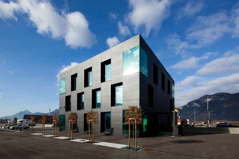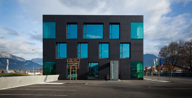 Das neue Büro- und Verwaltungsgebäude der H. Junger Bau Gmbh, eine seit Jahren aufstrebende und ständig expandierende Spezialfirma für Tunnel- und Brückenbau sowie Abdichtung, Schutz und Instandsetzung von Betonbauteilen, stellt durch Form- und Farbgebung einen direkten Bezug zur Firmenidentität dar. Die anthrazitgraue vorgehängte Eternit-Fassade repräsentiert den Werkstoff Beton, die raumhohen grünen Fenster stehen für die umweltbewusste Tätigkeit des Unternehmens.