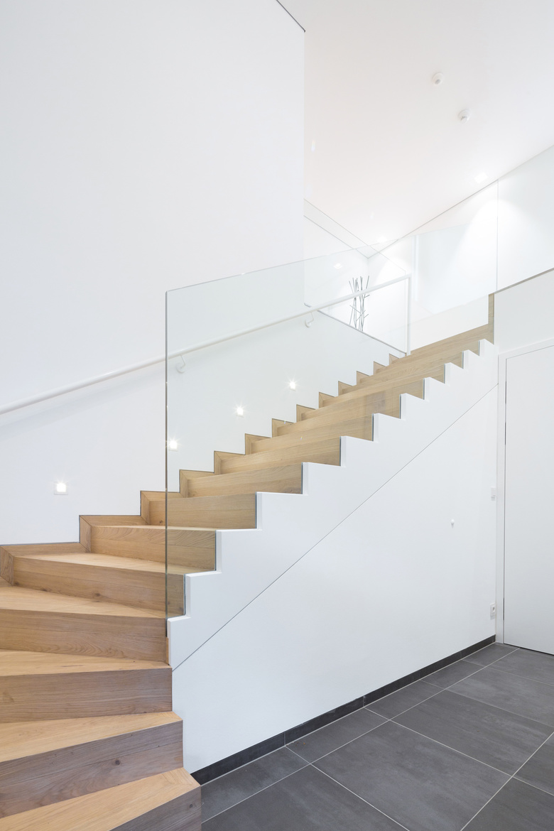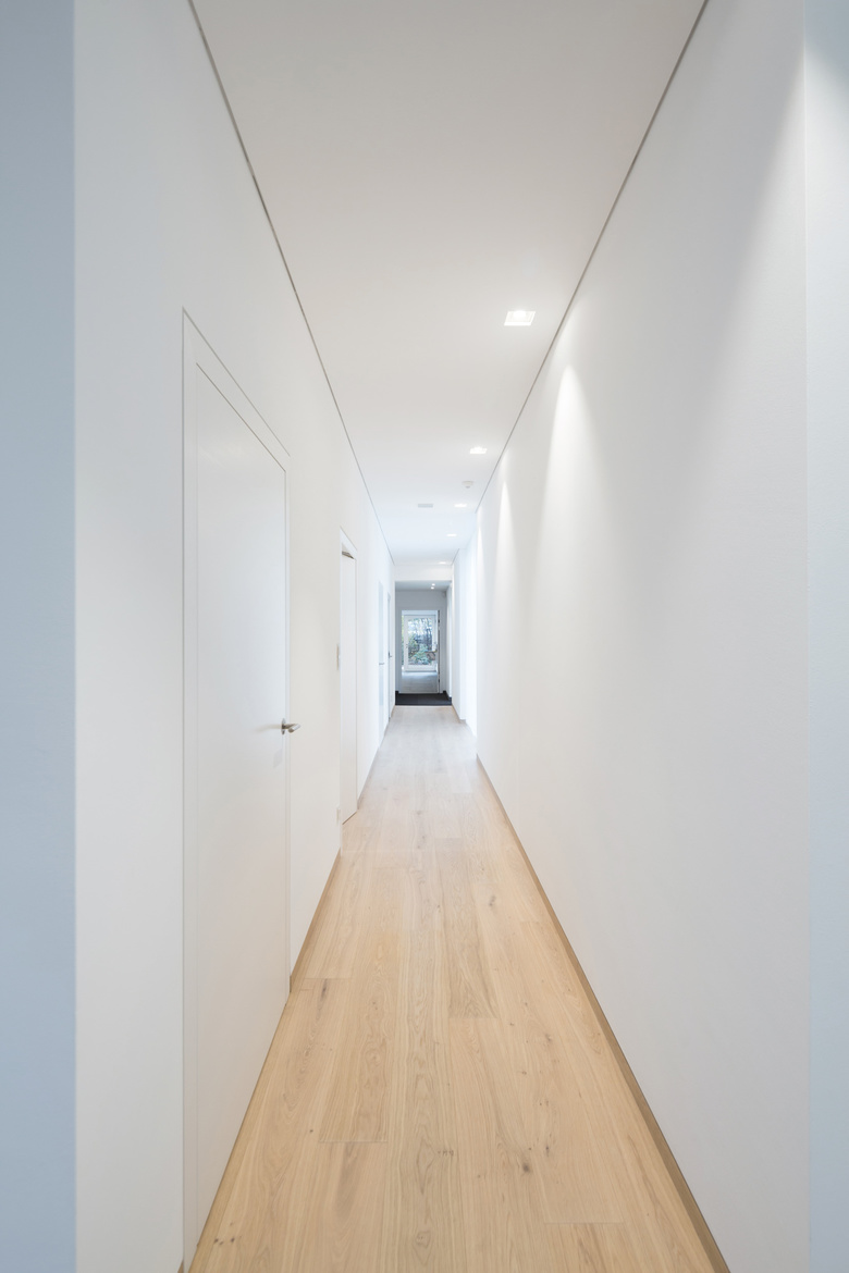 Die Wünsche des Bauherren, bzgl. Barrierefreiheit, Sonnenlicht, Sichtschutz und Abgrenzung waren sehr konkret. Ziel war es, einen Innenhof zu schaffen, welcher von Lärm bzw. Einblicken geschützt ist. Mittels eines L- förmigen Baukörpers konnte die Straße sowie die angrenzende Bebauung abgeschirmt werden. Durch diese Baukörpersituierung entstand ein geschützter Innenhof.