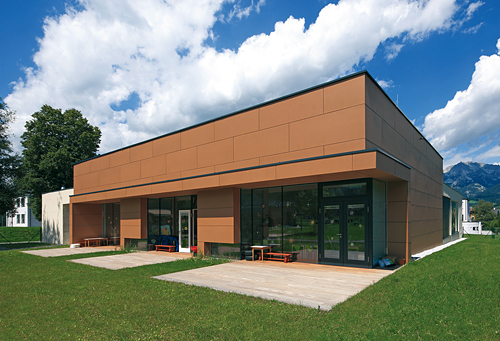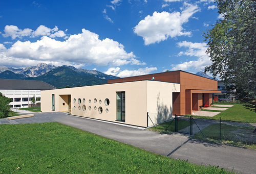 Die zentrale Anordnung und die verglasten Bauteile ermöglichen eine gewisse Transparenz sowie eine leichte Überschaubarkeit des Kindergartens. Durch die klare Anordnung der Bereiche wird ein kompakter Baukörper geschaffen, welcher die Gebäudehülle auf ein Minimum reduziert. Die schlichte und klare Form des Kindergartens trägt wesentlich zur kostengünstigen Errichtung des Bauwerks bei.