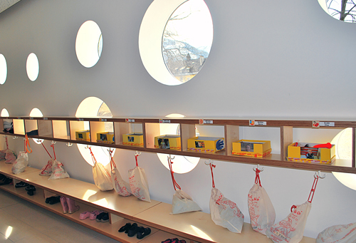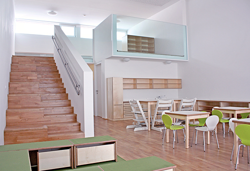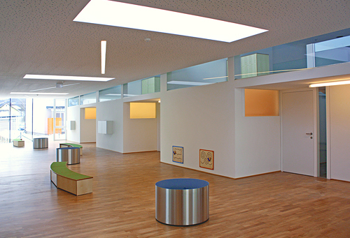 Die Gesamtkonzeption des Kindergartens ist funktionell klar ablesbar. Der Baukörper wird durch zwei Achsen in vier Bereiche geteilt. Die West-Ost Achse ist eine Erweiterung der Erschliessungsachse und geht in eine öffentliche Spielstraße über, welche als ein großzügiger, flexibler Kommunikationsbereich dient. Durch die Nord-Süd Achse wird der Freiraum erschlossen und unterteilt den Kindergartenbetrieb in einen Verwaltungsbereich in der Eingangszone, sowie in die Aktivitätsbereiche der Kinder.
