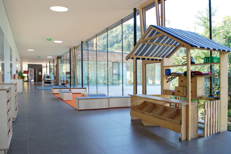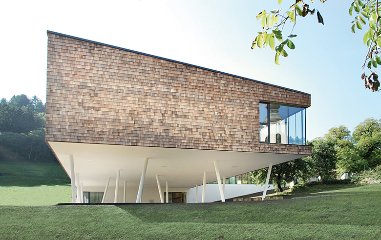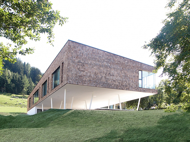 Der kompakte Baukörper in Verbindung mit Holzbauweise führt zur optimalen Energieeffizienz. Zusätzlich vermittelt die Bauweise im Inneren ein behagliches Raumklima. Für die Fassade wurde eine Lärchenschindeldeckung vorgesehen, da diese einen regionalen Bezug herstellt und der Witterung über Jahrzehnte hinweg ohne zusätzliche Wartungsarbeiten und Erhaltungsmaßnahmen trotzen kann.