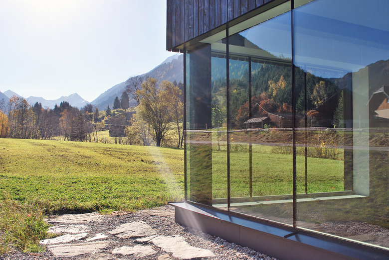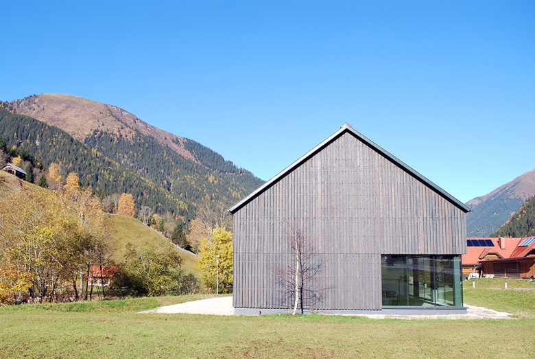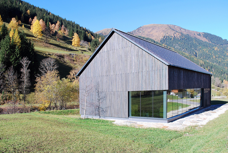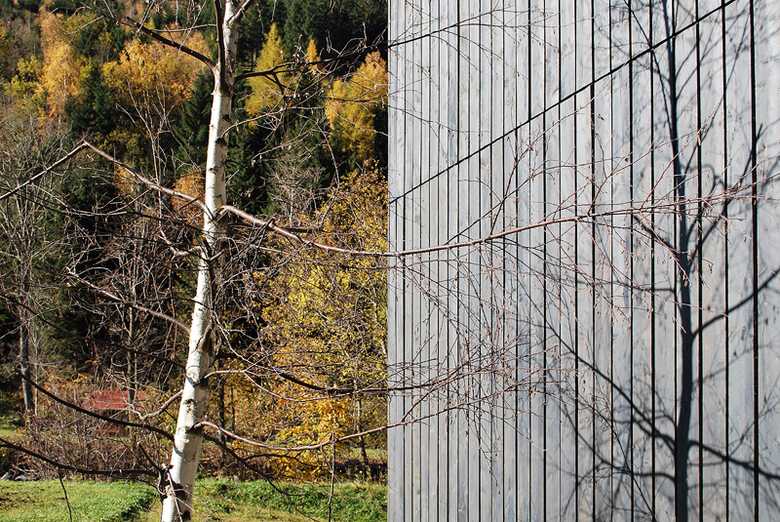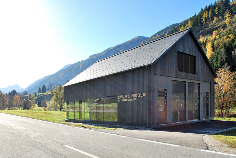 Dabei sollte das Volumen des Kraftwerkes durch die Bauform (Archetypus = Rückführung auf die reduzierte Urform) und eine gezielte Materialwahl optimal in die Landschaft integriert werden. Eine klar definierte Öffnung ermöglicht den Blick ins Innere des Gebäudes.