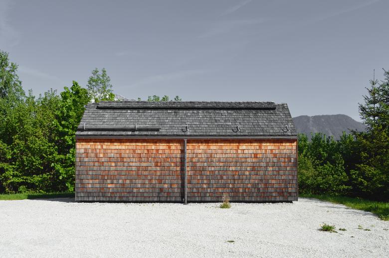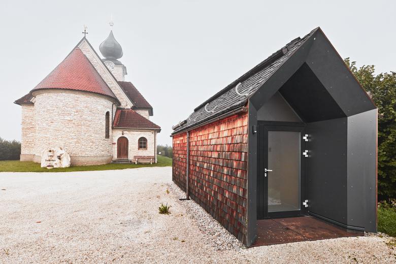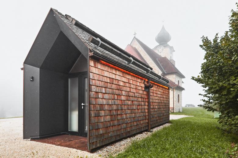 Die Fassade ist in Lärchenschindeldeckung ausgearbeitet, die einerseits den regionalen Bezug herstellt, andererseits im Dialog zum Mauerwerk der Kirche steht. Diese kann der Witterung über Jahrzehnte hinweg, ohne zusätzliche Wartungsarbeiten und Erhaltungsmaßnahmen, trotzen. Die Klarheit der Form wird durch die Holzfassade in seiner Schlichtheit bestärkt und verbindet sich somit mit dem umliegenden Landschaftraum.