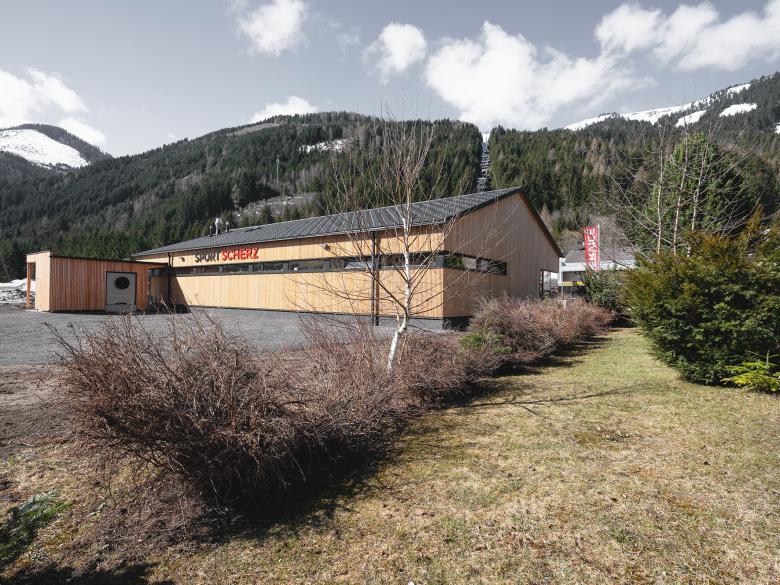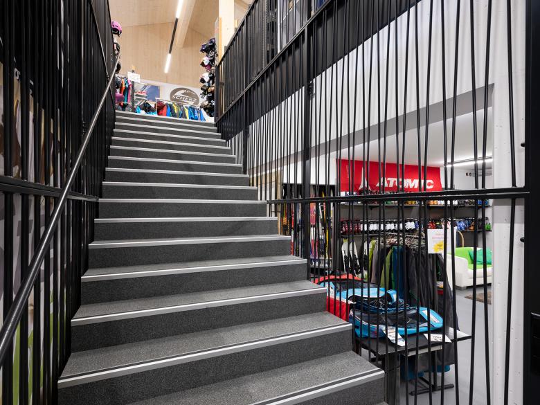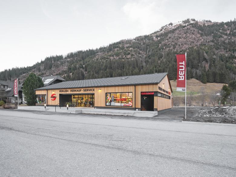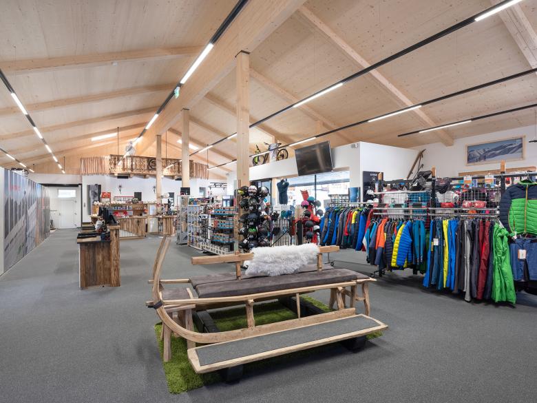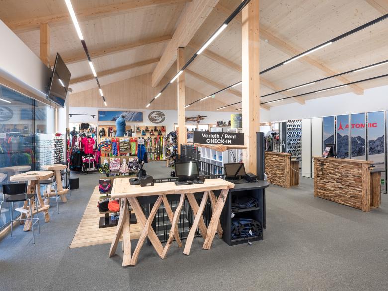 Im Erdgeschoss befinden sich, neben einer großzügigen Verkaufsfläche von ca. 700 m², das Skiservice und sowie ein Lagerraum. Das Kellergeschoß beherbergt das Schidepot samt Sanitärräumlichkeiten, einen Personalraum sowie einen Technik- und Lagerraum.