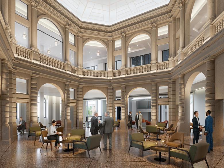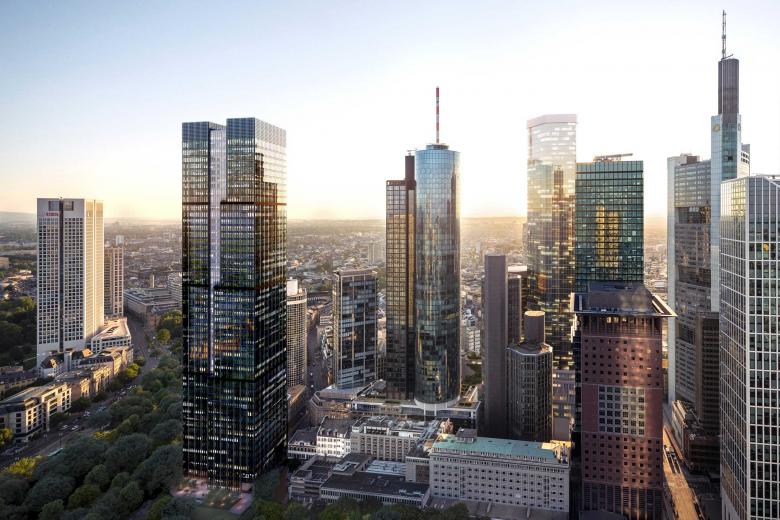 Das Credo unserer Entwurfsarbeit lautet: Ort, Kontext, Zeit und Nutzung einbeziehen. An der Mainzer Landstraße gab es bereits ein Neorenaissance-Bestandsgebäude, eine historische Rotunde - eine der wenigen erhaltene Kassenhallen eines Bankgebäudes aus dem Historismus -und viele moderne Hochhäuser. So entschieden wir uns bewusst für ein hybrides Ensemble. Anders als bei konventionellen Bürotürmen bildet unser Entwurf eine Triade aus Hochhaus, historischen Sockelbau mit Museum und öffentlicher Passage. Im Erdgeschoss entsteht eine durchlässige Eingangsebene zwischen Neuer Mainzer Straße und Wallanlagen als überdachter öffentlicher Raum. Über fünf Etagen erstrecken sich die öffentlich zugänglichen Nutzungen wie Restaurants, Café, Weinbar und Museum. Durch die publikumsintensive Verknüpfung von Büronutzung, Alltagsleben und Kultur erreichen wir, dass Stadtleben und Arbeitswelt ineinandergreifen.