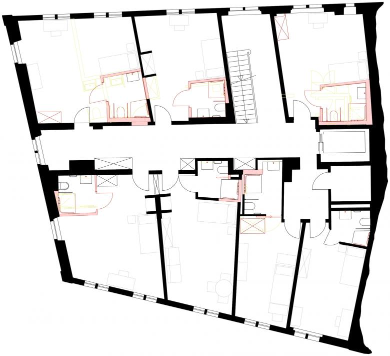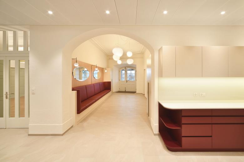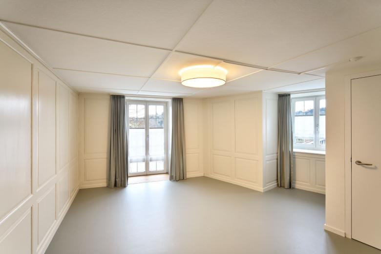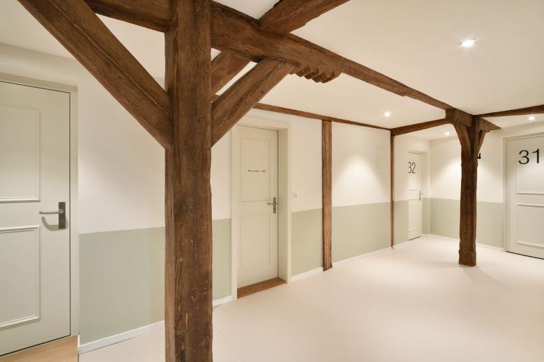Das rund 450 Jahre alte Riegelhaus wurde im Rahmen einer umfassenden Sanierung behutsam modernisiert. Ziel des Projekts war es, die historischen Qualitäten des Gebäudes zu erhalten und gleichzeitig den heutigen Anforderungen an Komfort, Funktionalität und Barrierefreiheit gerecht zu werden. Zahlreiche kleinere Umbauten aus vergangenen Jahren wurden im Zuge der Arbeiten überprüft und in ein stimmiges Gesamtkonzept integriert. Im Zentrum der Sanierung standen neben den gemeinschaftlich genutzten Räumen wie dem Speisesaal, der Stube und dem Ankunftsbereich im Erdgeschoss, die Bewohnerzimmer. Diese wurden neu strukturiert, teilweise zusammengelegt und mit modernen, den Bedürfnissen eines Wohn- und Pflegeheims angepassten Nasszellen ausgestattet.