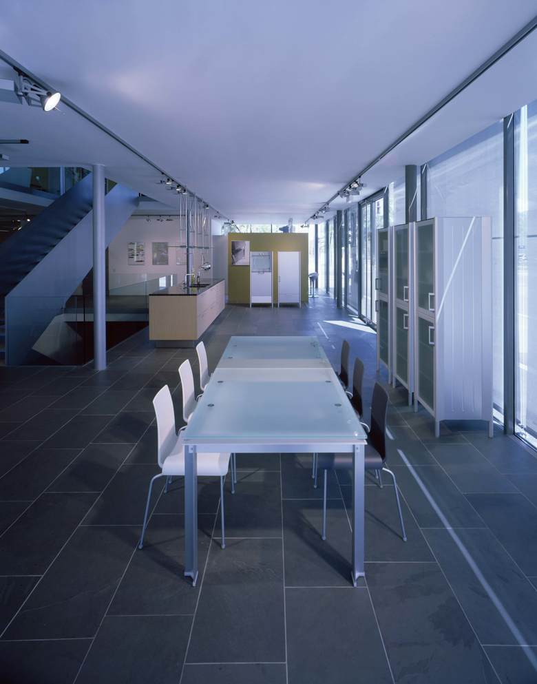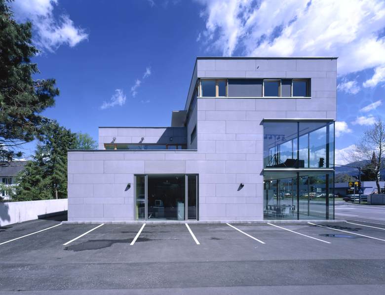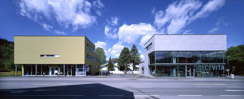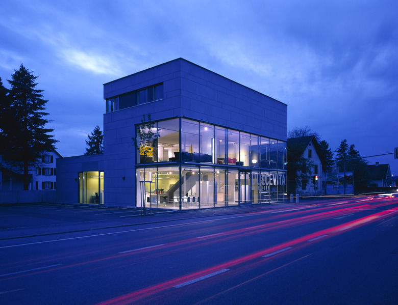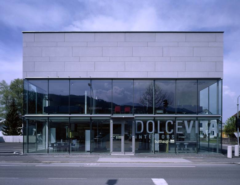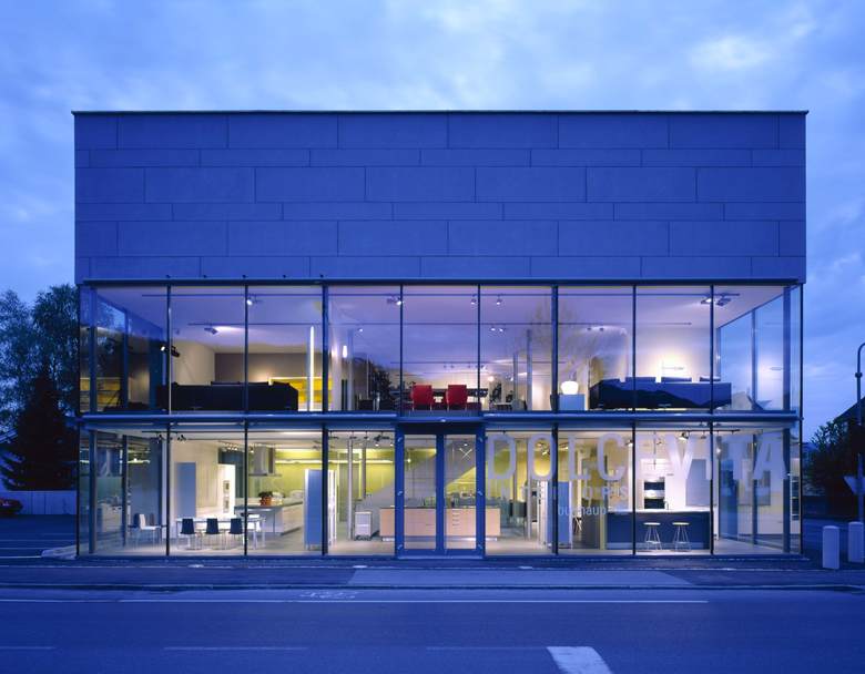 Kubus, Luft, Kubus: Das dicht an die Bundesstrasse -B190- gerückte Wohn- und Geschäftsensemble besteht aus zwei identisch dimensionierten Kuben von je 16,5 Metern Seitenlänge, die durch ein ebenso großes Luftvolumen, das dem ruhenden Verkehr vorbehalten ist, auf Harmonie-Distanz gehalten werden. In den unteren beiden, verglasungsreichen Geschoßen des einen Hauses ist “Dolce Vita” angesagt, hier präsentiert der Hauptnutzer des Geschäfthauses italienisches Möbeldesign. Und in den Räumen rundum wird das Dolce Vita in der Praxis erprobt: im ersten Obergeschoss ist eine südwestorientierte 3-Zimmerwohnung mit großer Terrasse untergebracht, während sich die Bewohner der 5-Zimmerwohnung darüber gar an einer teils überdachten Freifläche von 70 m2 erfreuen dürfen.