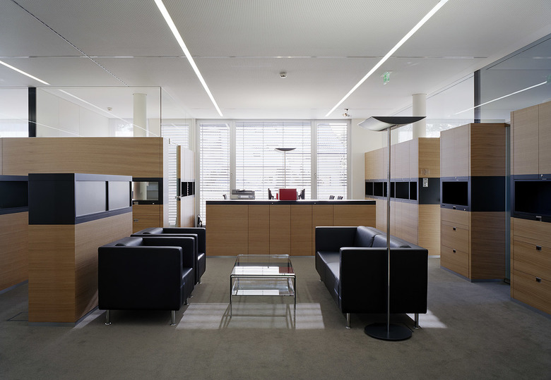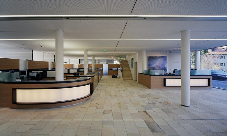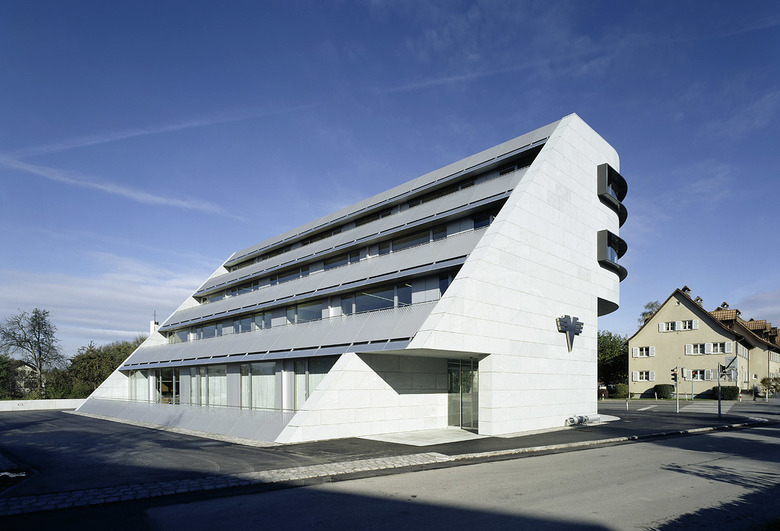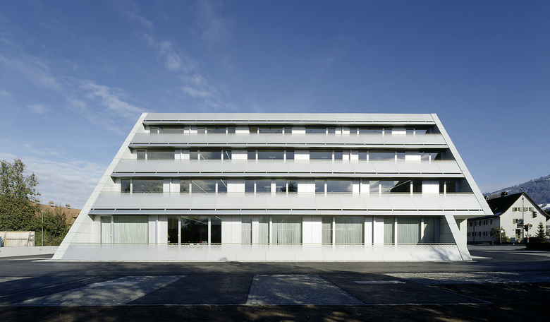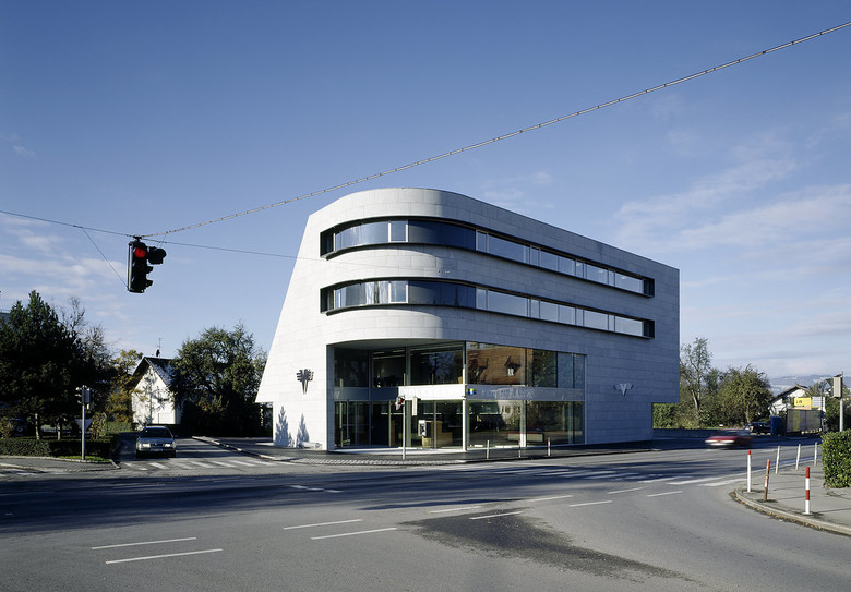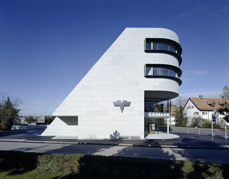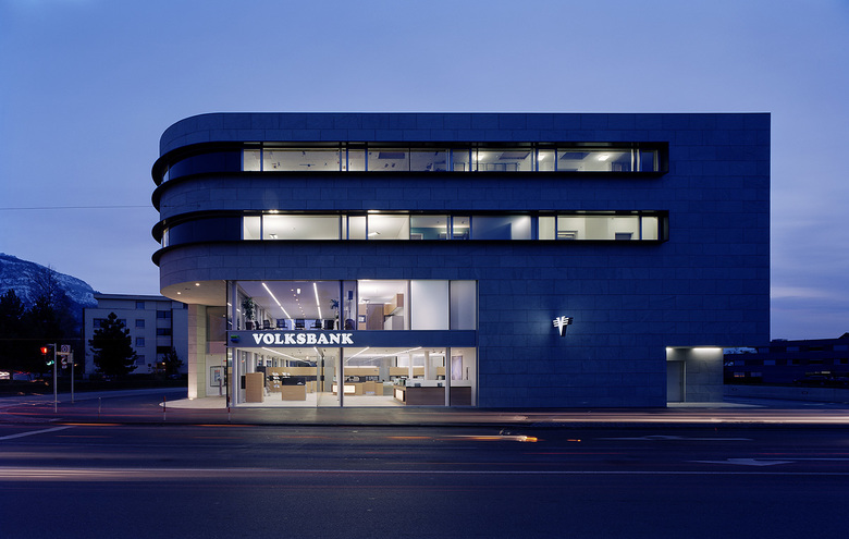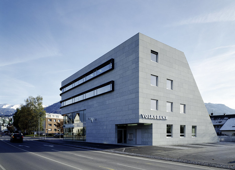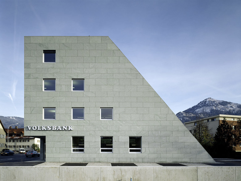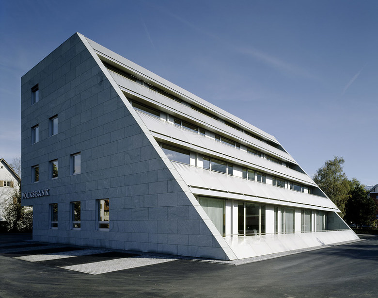 Zentrale der Vorarlberger Volksbanken für den Bezirk Dornbirn. Zur Straße zeigt das Gebäude die hermetische Steinfassade (Andeer), nach Süden mit Blick übers Rheintal in die Schweizer Berge öffnen sich die Büros zu vorgelagerten Terrassen.