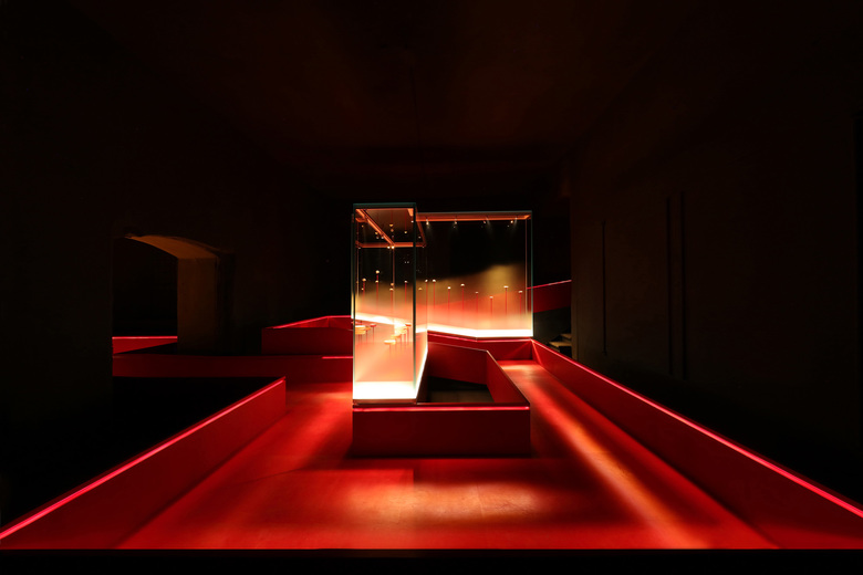 Der Steg und seine niedrige Balustrade sind mit rotem Leder bezogen. Die Lauffläche wird durch ein verdecktes LED-Lichtband in der Aufkantung zum freischwebendem Pfad in einer nicht greifbaren, völlig ausgeblendeten Raumhülle.
