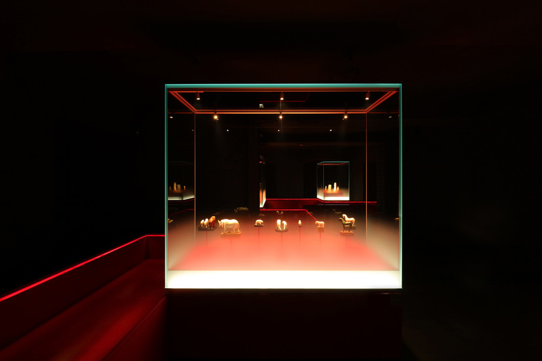 Die Vitrinengläser sind im unteren Drittel satiniert und werden aus der Vitrinenbasis heraus mit Kantenlicht eingespeist. So nimmt die Satinierung eine sanfte Helligkeit ein, die einem Dunst gleich, die Objektträger der Elfenbeinfigurinen verhüllt.