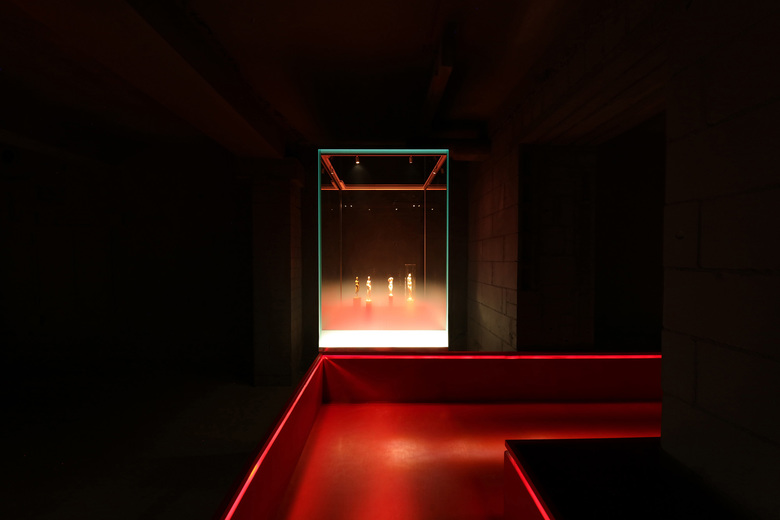 Einer der Räume nutzt vorhandene historische Wandschränke, in denen eine Fülle von kleinen Objekten auf der mit Molton bezogenen Rückwand befestigt sind. Diese werden durch im Möbel verdeckt montiertes, lineares Licht hervorgehoben.
