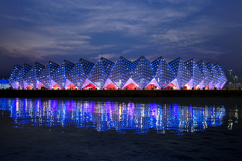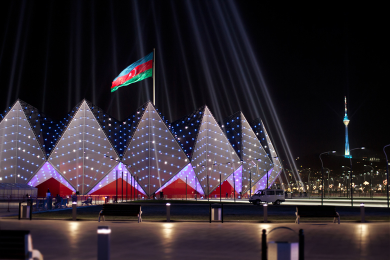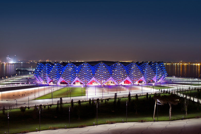 Pünktlich zum Eurovision Song Contest 2012 konnte die Baku Crystal Hall - ein moderner, multifunktionaler Veranstaltungskomplex, in dem bis zu 23.000 Besucher Platz finden - nach der Rekordbauzeit von lediglich acht Monate fertiggestellt werden. Seine charakteristische, kristalline Erscheinung verdankt der 206 Meter lange und 168 Meter breite Stahlbau seiner Verkleidung mit einer illuminierten Membranfassade, die vor allem nachts zu beeindrucken weiß: 5.400 LED-RGB-Lichtpunkte setzen das Gebäude eindrucksvoll in Szene und erzeugen so ein prägnantes Bild mit Fernwirkung.