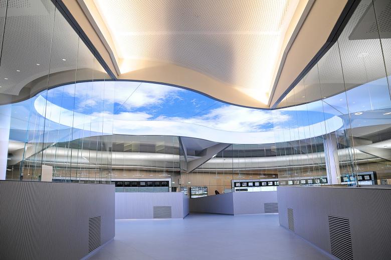 Der Auftraggeber hat keinen Aufwand gescheut, um eine bunkerähnliche Atmosphäre zu vermeiden. Zwei Raumelemente wurden hierfür entwickelt: Das Digitale Fenster und ein virtueller Himmel.