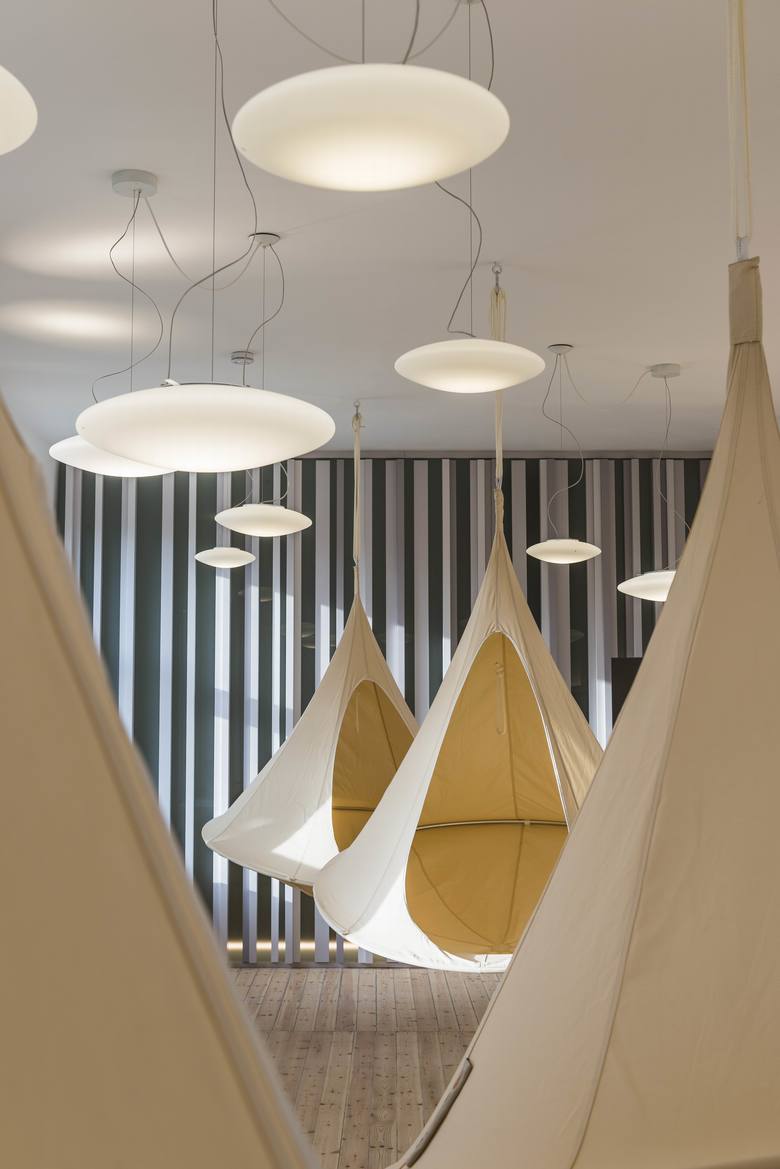 Das Gesamtkonzept für die Büroflächen umfasst auch ein Restaurant, eine Lounge, einen Meditationsraum, einen Fitnessraum, eine Sauna sowie einen Kindergarten. Die Lichtplanung definiert mit den innenarchitektonischen Elementen eine integrierte Lösung. Die offenen Flächen wurden mit einer linear gestaffelten Beleuchtungsanlage versehen. Die privateren Bereiche wie Telefonzellen und Besprechungsräume wurden mit dekorativen Pendelleuchten gestaltet. Die Verkehrsflächen sind mit großflächigen, hinterleuchteten Leuchtkästen mit künstlerischen Drucken ausgestattet. Das Thema der Leuchtkästen leitet die Besucher durch den Komplex. Die verschiedenen Einzelfunktionen haben ihre eigene Lichtidentität durch Beleuchtungspools, die nur der allgemeinen Idee folgen, Blendpunkte zu minimieren und die Leuchten in die Innenarchitektur zu integrieren. Die enge Zusammenarbeit zwischen Vuković+Rogulj und Lichtvision Design in der Entwurfsphase ermöglichte es den Innenarchitekten, das endgültige Layout in der Bauphase fortzusetzen und in ein schönes Schema zu bringen.