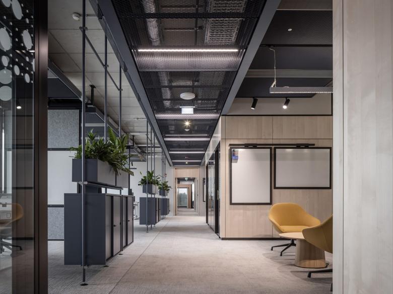 Die Lindner Group spielte eine entscheidende Rolle beim Innenausbau des Gebäudes, insbesondere in den Bürobereichen. Maßgeschneiderte Glas- und Holztrennwände bieten nicht nur effektive Trennung der Büroräume, sondern schaffen eine angenehme akustische Atmosphäre dank hohem Schallschutz. Passende Aluminium-Rohrrahmentüren ergänzen das moderne Erscheinungsbild der Innenraumgestaltung.