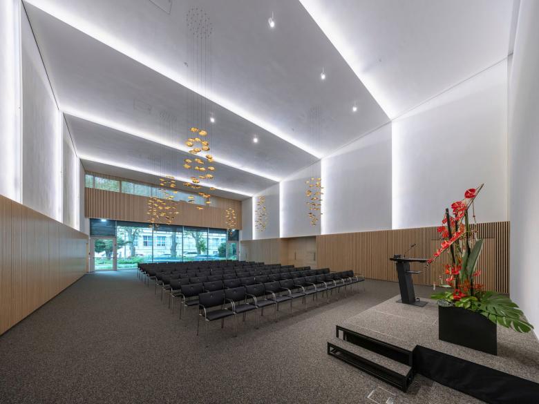Ein Highlight im Erdgeschoss ist das großzügige Maki-Forum, ein Veranstaltungsraum, der für Vorträge und Workshops, Galas oder Konzerte sowie auch für private Feierlichkeiten gemietet werden kann. 2,7 m hohe Holzlamellen aus Birke an den Wänden, gefertigt von Lindner Objektdesign in der hauseigenen Schreinerei, schaffen eine warme, einladende Atmosphäre und sorgen für optimalen Raumklang.