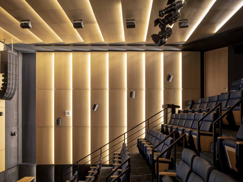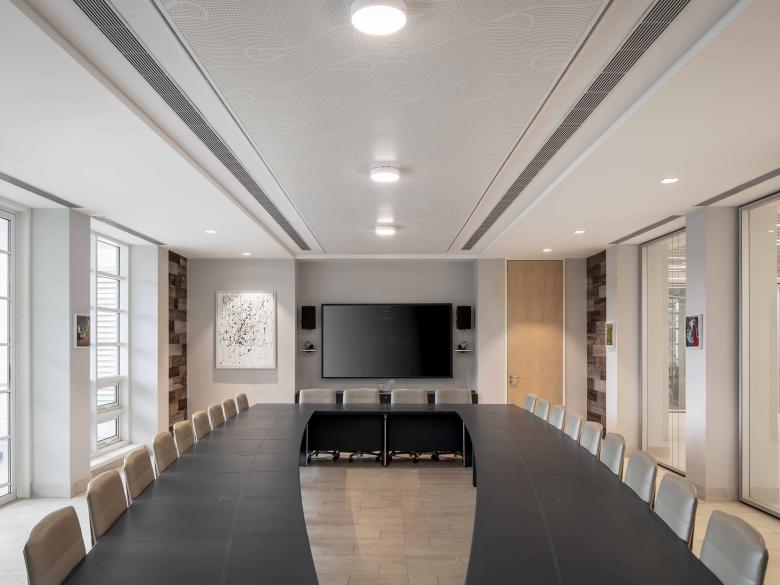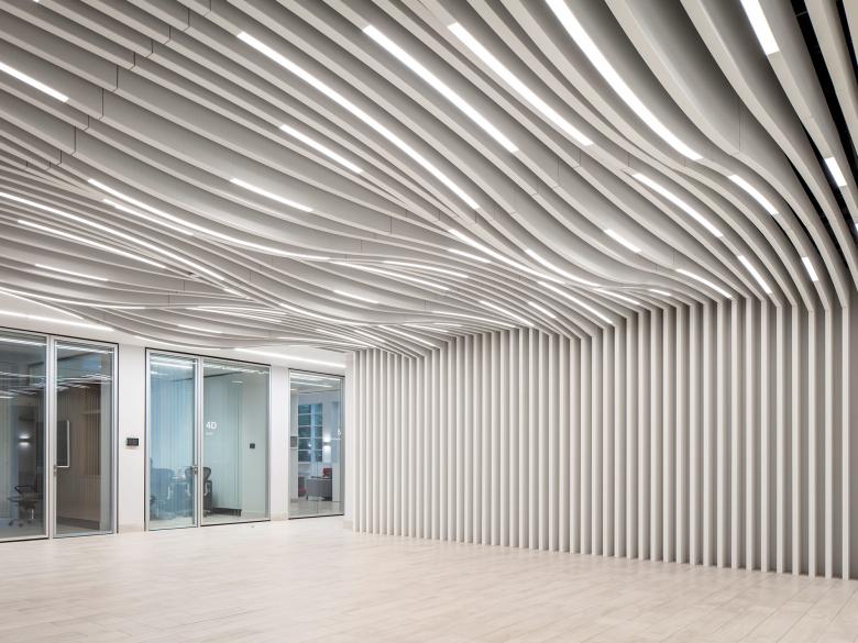 Für den Innenausbau waren in weiten Teilen die Lindner Group aus dem niederbayerischen Arnstorf und deren Niederlassung in Dubai verantwortlich. So verbaute Lindner z. B. im Auditorium Wand- und Deckenbekleidungen aus Metall vom Typ Lindner Free mit integrierten LED-Lichtkanälen LK 18 LED. Die Lindner COMPwood Decken- und Wandbekleidungen sind dabei gestaffelt angeordnet und als 900 x 900 mm Wabenelemente mit Echtholzapplikation ausgeführt. In der Decke des Bankettsaals und im Sitzungsraum finden sich die Metall-Deckenpaneele LMD-E mit speziellem LED-Muster bzw. mit Perforationen in Form des Firmenlogos wieder. Die Lichtvariationen werden auch bei der Lamellendecke LMD-LAOLA Shine sowie bei weiteren Decken-/Lichtlösungen in verschiedenen Bereichen fortgeführt.