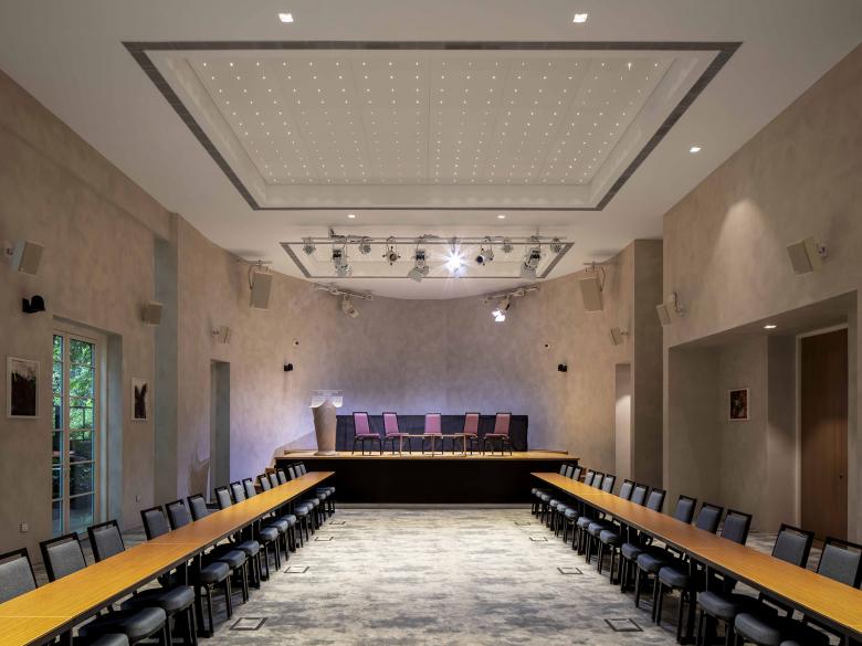 Das Research-Zentrum verteilt sich auf insgesamt 4,5 Morgen Land und verfügt neben modernsten Arbeits- und Besprechungsräumen über eine 300 m² große E-Bibliothek, ein Auditorium mit ca. 100 Plätzen und eigenem Fernsehstudio. Für größere Veranstaltungen ist der Bankettsaal mit bis zu 300 Plätzen vorgesehen, ausgestattet mit D & B Audiotechnik, individuellen LED-Lichtlösungen und raumakustischer Optimierung.