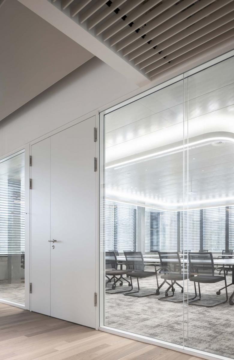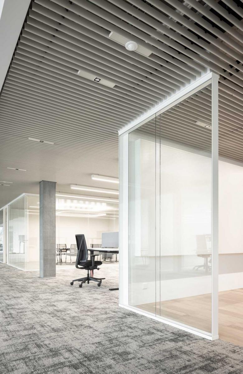 Ergänzend wurden außerdem revisionierbare Schalterpaneele eingebaut. Zwischen den Glastrennwänden setzte Lindner Holztrennwände sowie klassischen Trockenbau ein – die Gewerke ergänzen etliche Sonderwandabschlüsse, die verdeckt in das Wandsystem integriert wurden. Der Doppelboden LIGNA komplettiert die harmonische Optik der Innenräume.