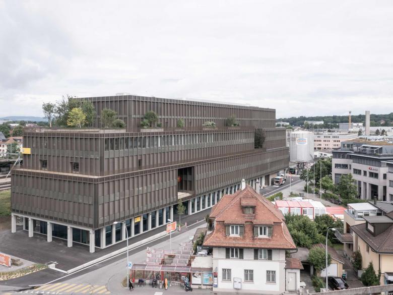 Bei den ca. 18.000 m² umfassenden Mietflächen setzte man auf eine helle und ruhige Gestaltung: Die Innenräume zeichnen sich durch viel Weiss, helle Holztöne und grau gemusterte Teppichböden aus – so entsteht eine einladende und freundliche Atmosphäre. Die Aussenarchitektur ist ebenfalls ein echter Blickfang: Die braune Fassade schafft einen Bezug zur früheren industriellen Nutzung der Gegend. Besonders dynamisch wirkt das Gebäude durch die terrassierte Abstufung und die Dachbegrünung.